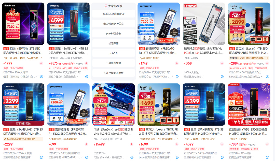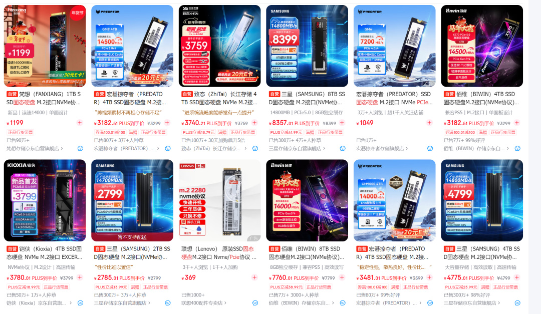 幾款比較受歡迎的PCIe 4.0硬盤,致態TiPlus7100s 2TB售價是1889元,宏碁掠奪者GM7000 4TB售價是3249元,三星990 PRO 4TB售價爲4499元,西部數據SN850X 4TB是7889元,8TB更高達14914元。