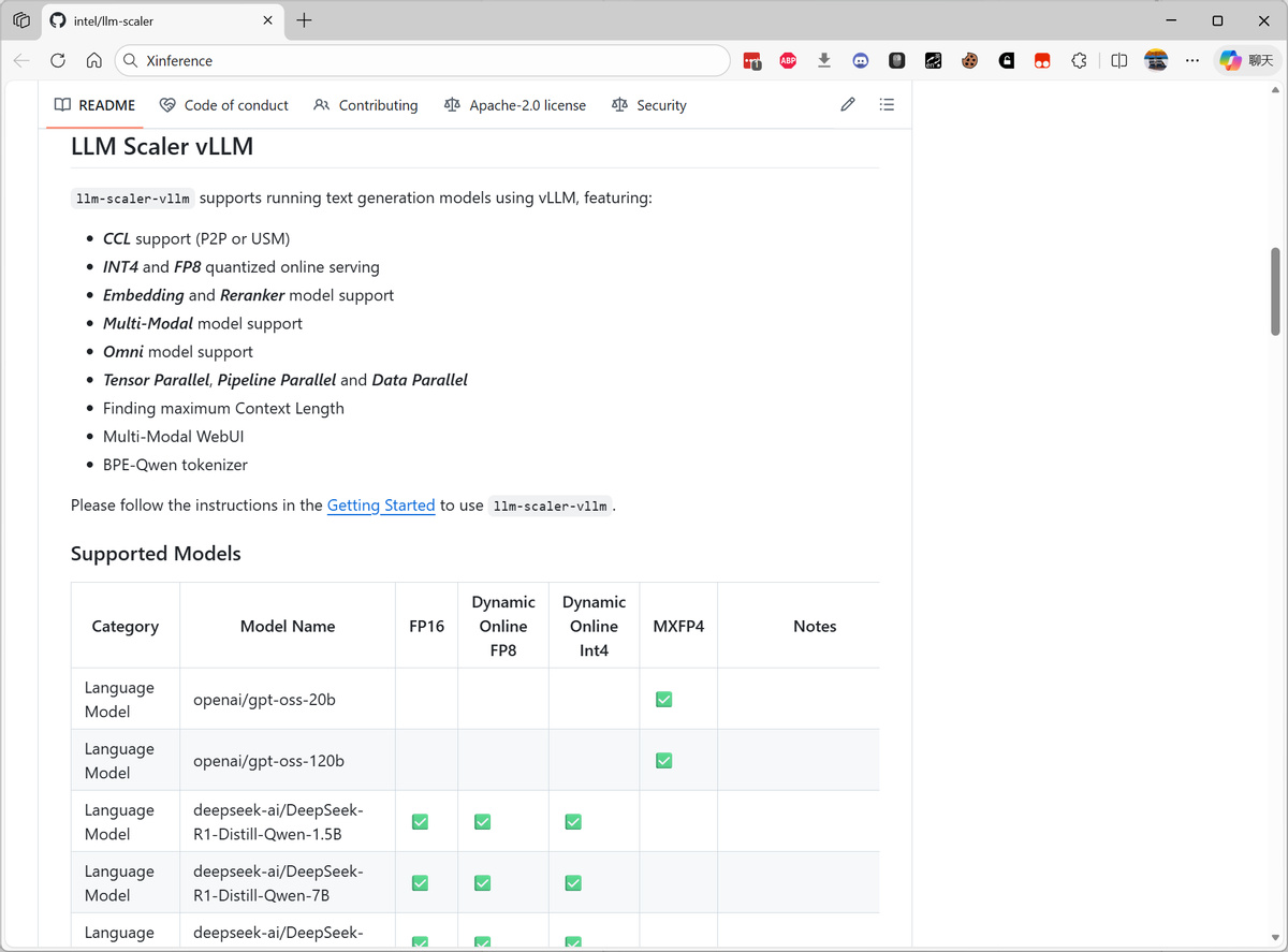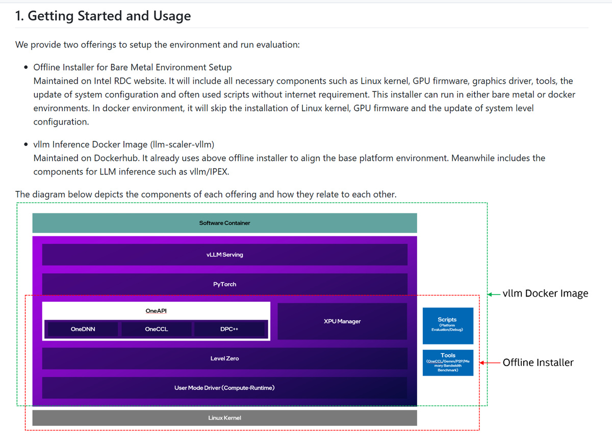在軟件支持方面,Intel 目前提供了 LLM-Scaler 和 LLM-Scaler Omni,LLM-Scaler是英特爾提供的vLLM Serfving鏡像版本,和開源的vLLM Serving是統一的,是Intel針對生成式AI推理的性能優化解決方案。LLM-Scaler Omni是支持多模態模型的推理框架,也是LLM-Scaler發佈的另一個Docker鏡像。