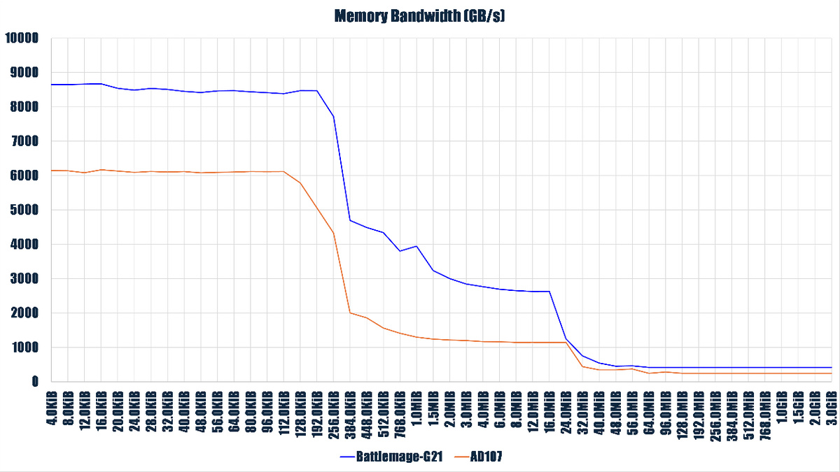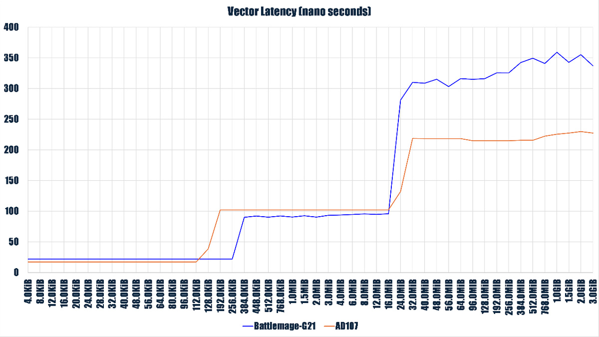 AD107 在 L1 Cache 階段擁有更快的時延,但是在 L2 Cache 階段則更慢,而且 L2 Cache 發生躍升的位置(20 MiB)也只是在宣稱(48 MiB)的 L2 Cache 一半不到,在進入訪存階段後,B60 的訪存時延開銷要比對手高很多。