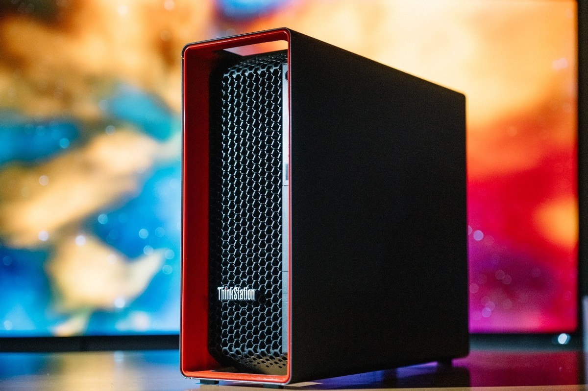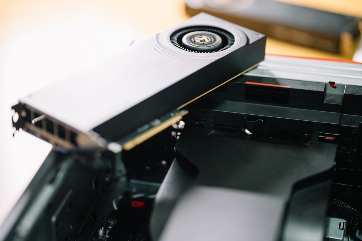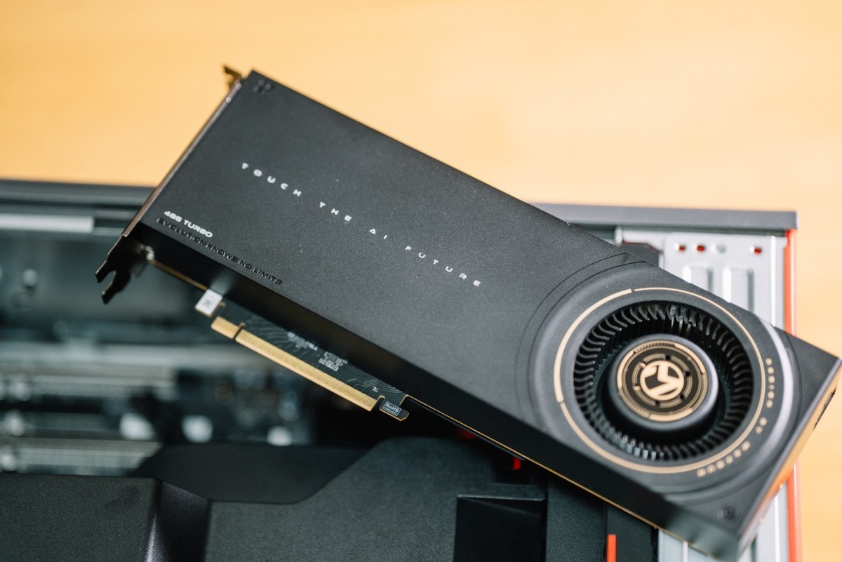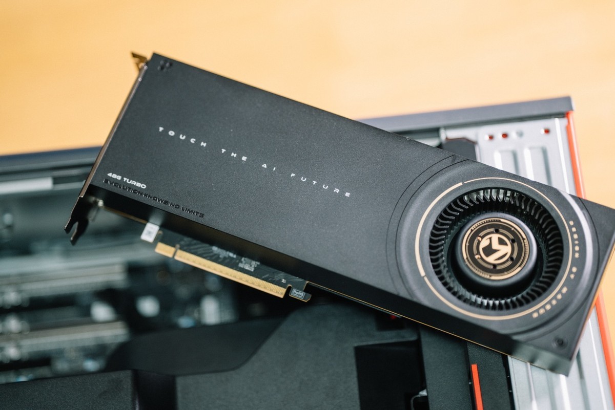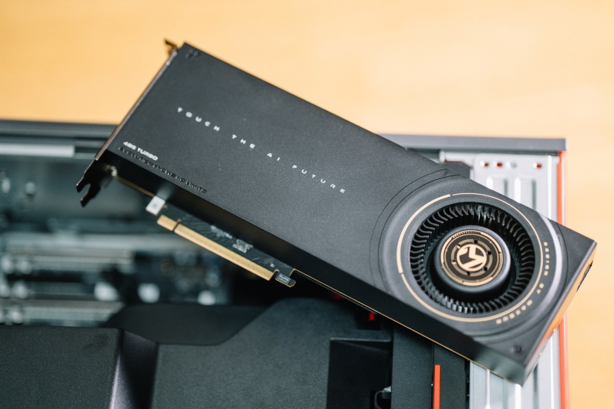 測試之前,有必要介紹一下測試平臺。這次下血本用上了旗艦配置的ThinkStation P7工作站,這套方案由聯想與阿斯頓馬丁聯合設計,工作站本身可以支持3張雙槽位渦輪風扇顯卡,因此裝下兩張銘瑄Intel Arc Pro B60 Dual毫無問題。只需要將末端的限位扣提起,裝入顯卡後再將限位扣壓緊,顯卡即可完成。