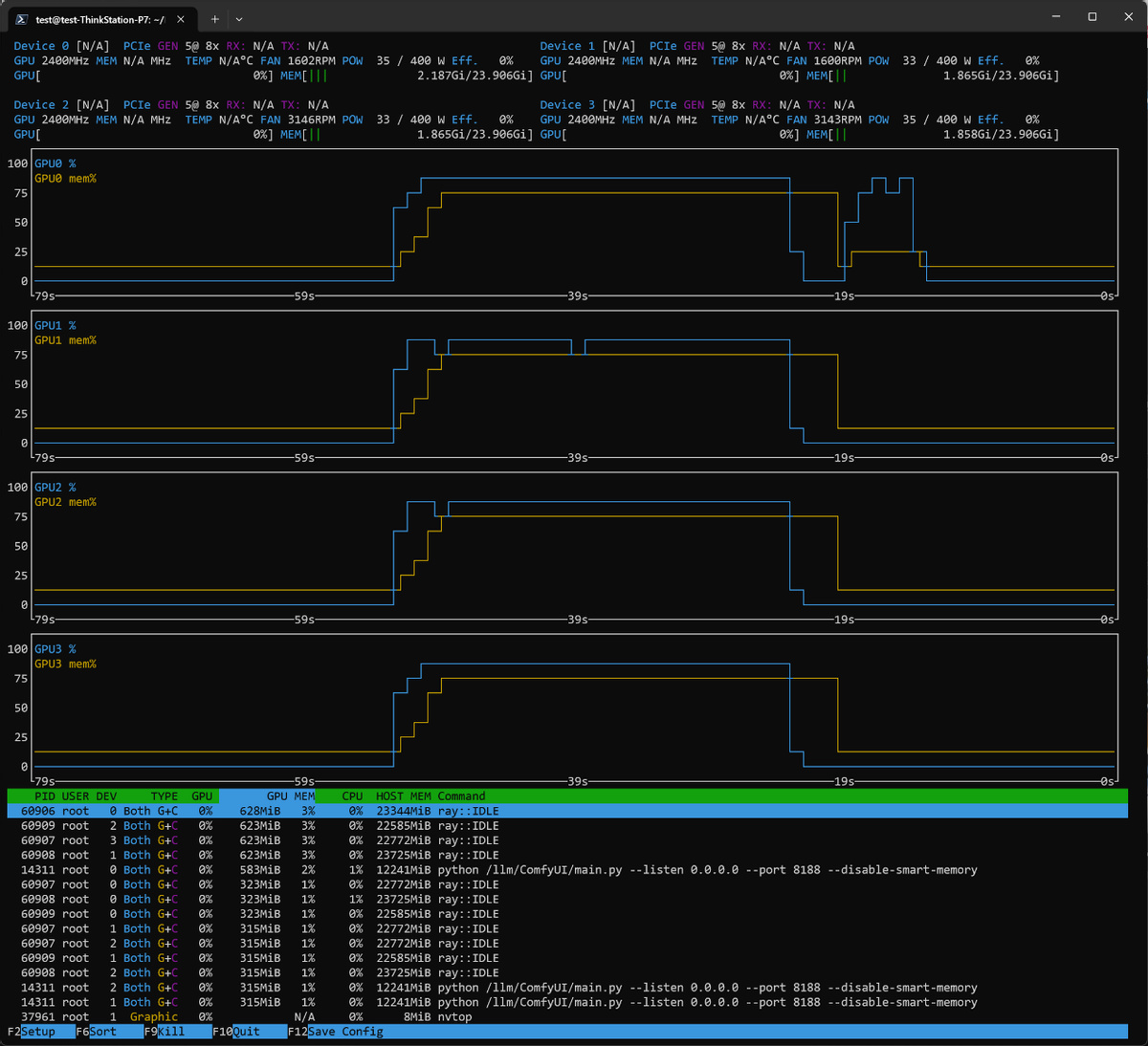 下圖就是使用 Raylight 節點時候多 GPU 同時啓用的狀態圖。