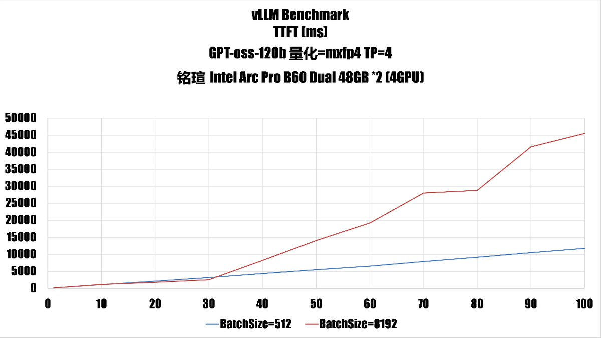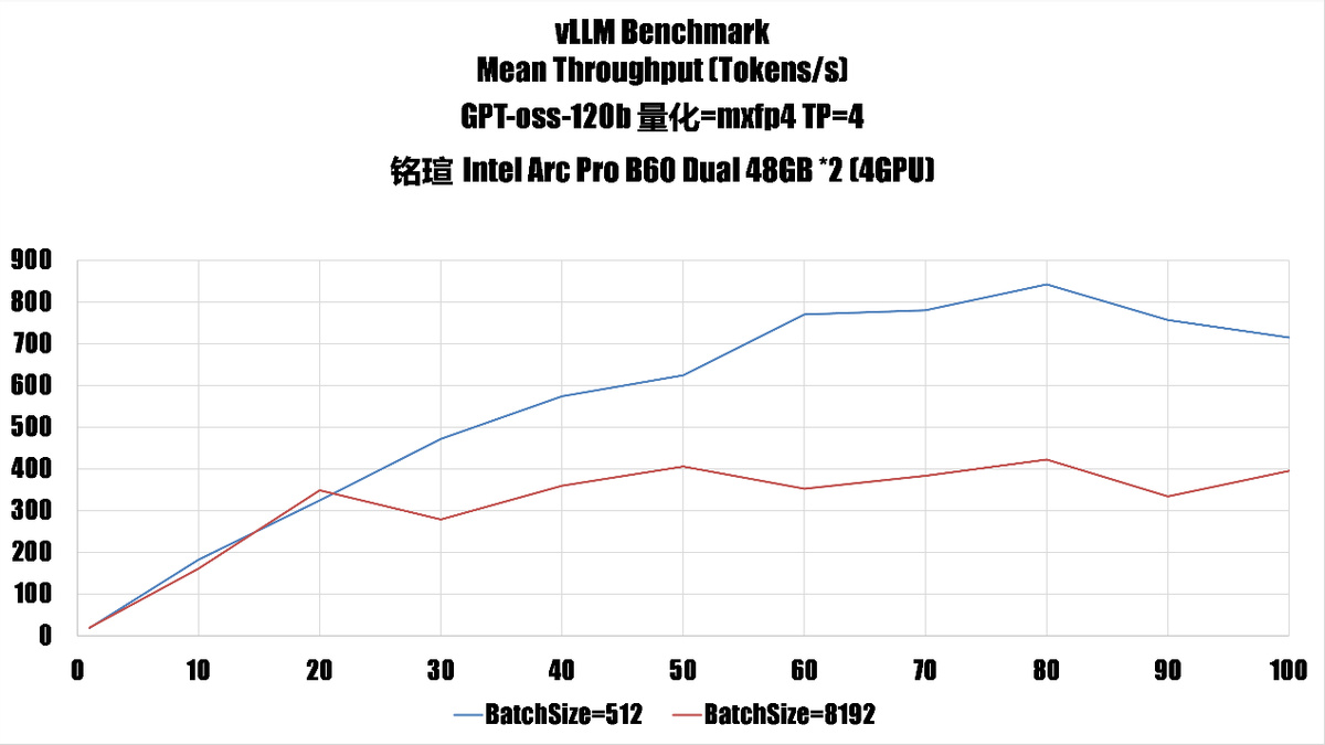 增加 number_prompt 後的吞吐性能在 80 個後開始下降,這意味着對於 4 GPU B60 來說,運行 gpt-oss-120b 合理 np 值應該在 80 左右。