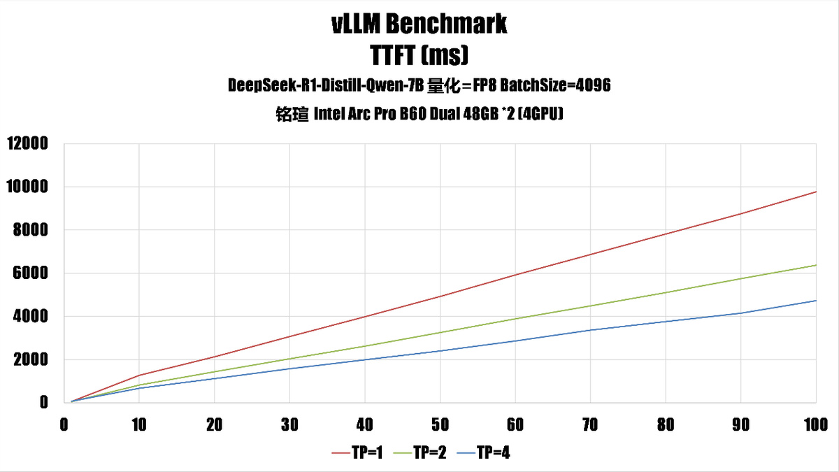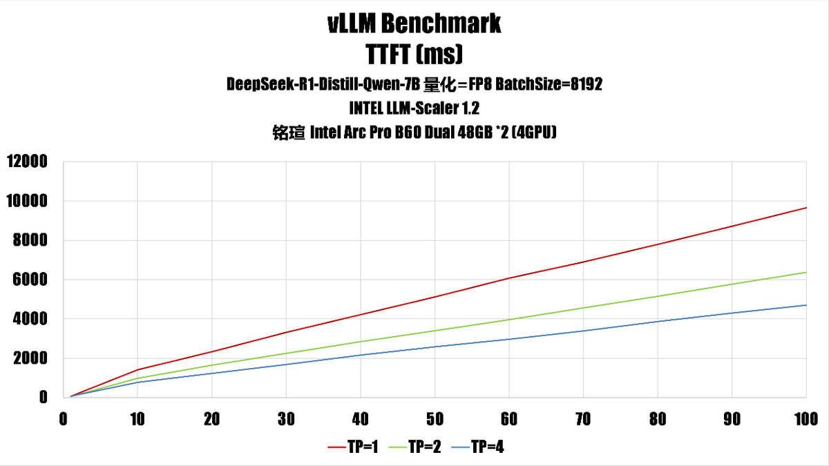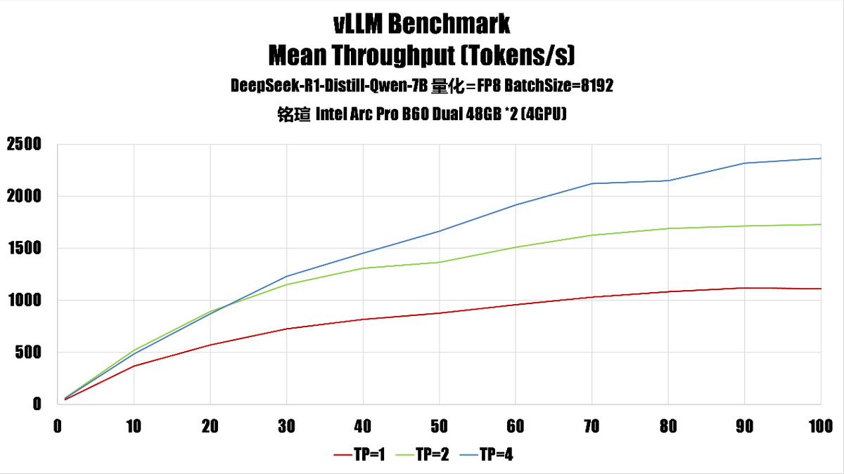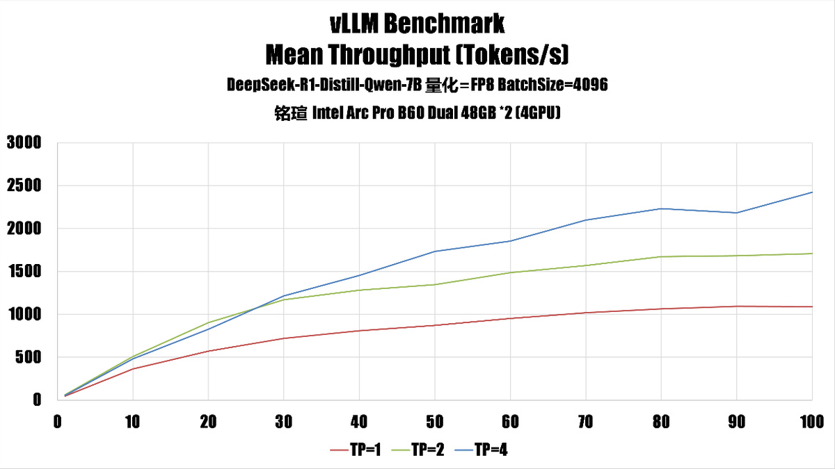 我們使用上面的指令作爲模板,使用大量不同的參數、推理模型進行了測試,得出了銘瑄 Intel Arc Pro B60 DUAL 48GB 在單卡、雙卡、四卡時的性能。