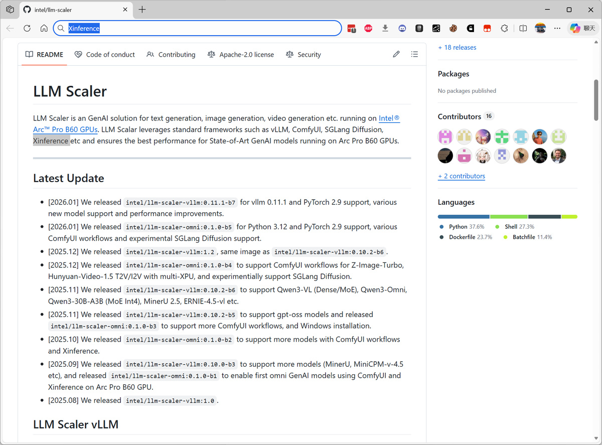 LLM-Scaler 可以用於文本生成、圖形生成、視頻生成等應用,支持包括 vLLM、ComfyUI、SGLang Diffusion、Xinference 等常見的開源推理框架項目,確保 Intel Arc Pro B60 跑上述應用的時候提供最佳性能。