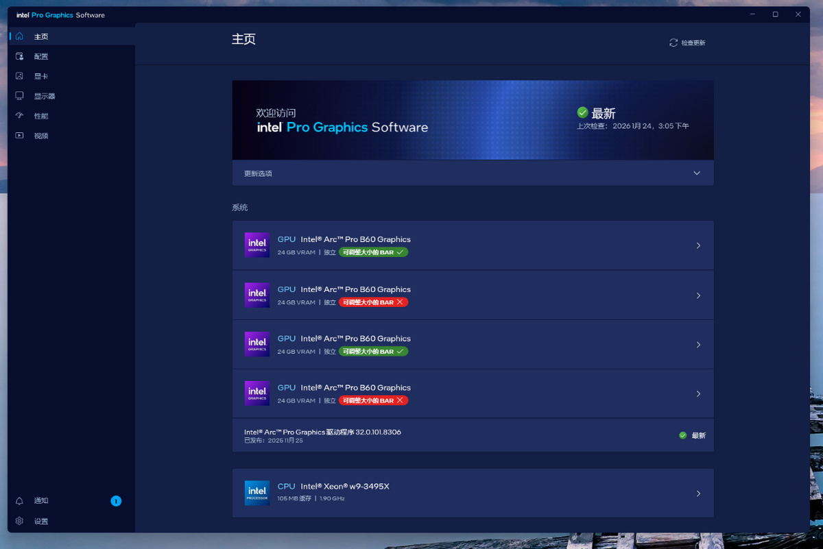 最後是在Windows 11環境下,安裝驅動後,4個Arc Pro B60 GPU被正確識別。有意思的是,雖然在BIOS中開啓了Resizable BAR,但是在Windows驅動中會有2個GPU的Resizable BAR被識別沒有被開啓,但在Ubuntu中沒有這個問題,因此不影響後續我們在Ubuntu中進行的測試。