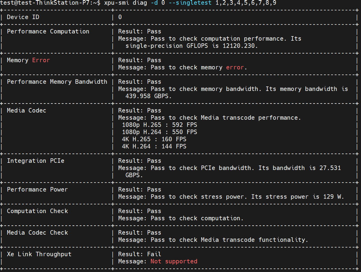 大家可以看到,這條 xpu-smi 指令測試出來的 Arc Pro B60 單 GPU FP32 性能是 12.1 TFLOPS、內存帶寬是 440 GB/s、4K H.265 解碼性能是 160 fps、PCIE 總線帶寬未 27.5 GB/s、壓力測試下的功耗值未 129 瓦。