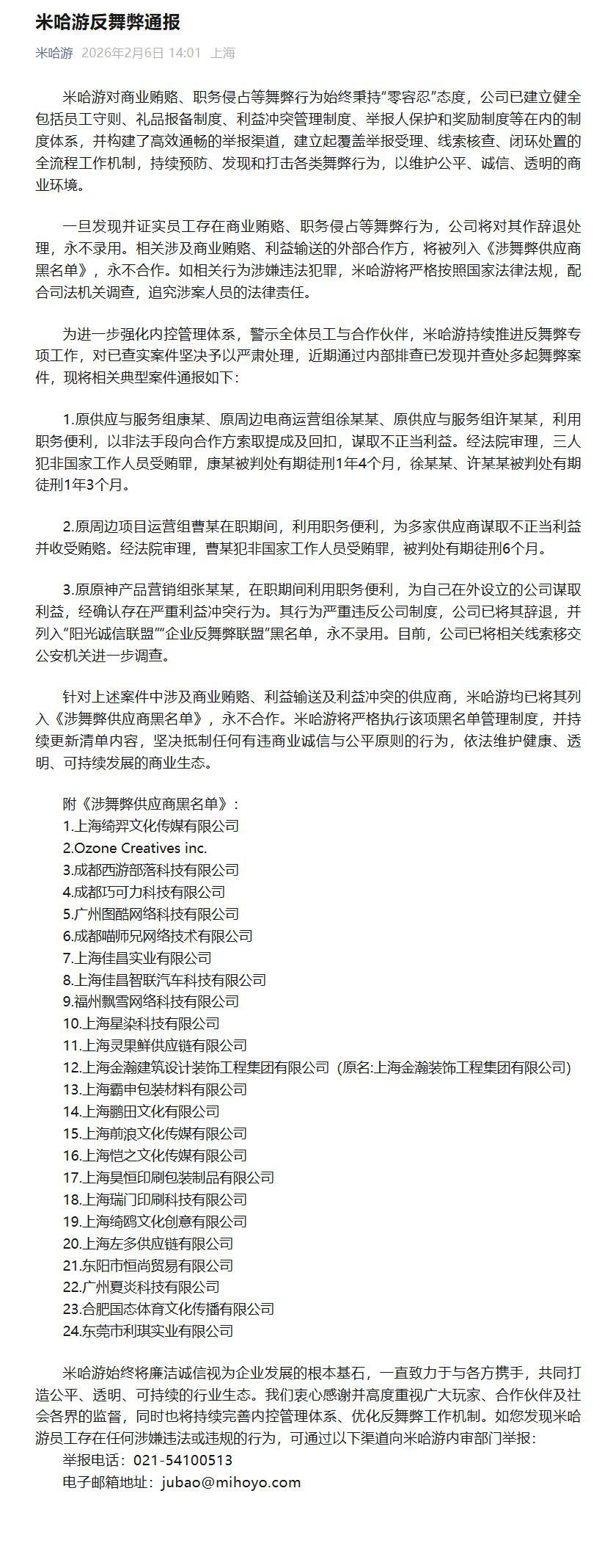 (吐槽:反腐的風到底也是吹到了米哈遊,拉黑這24家供應商裏頭有4家已經被完美世界拉黑了)