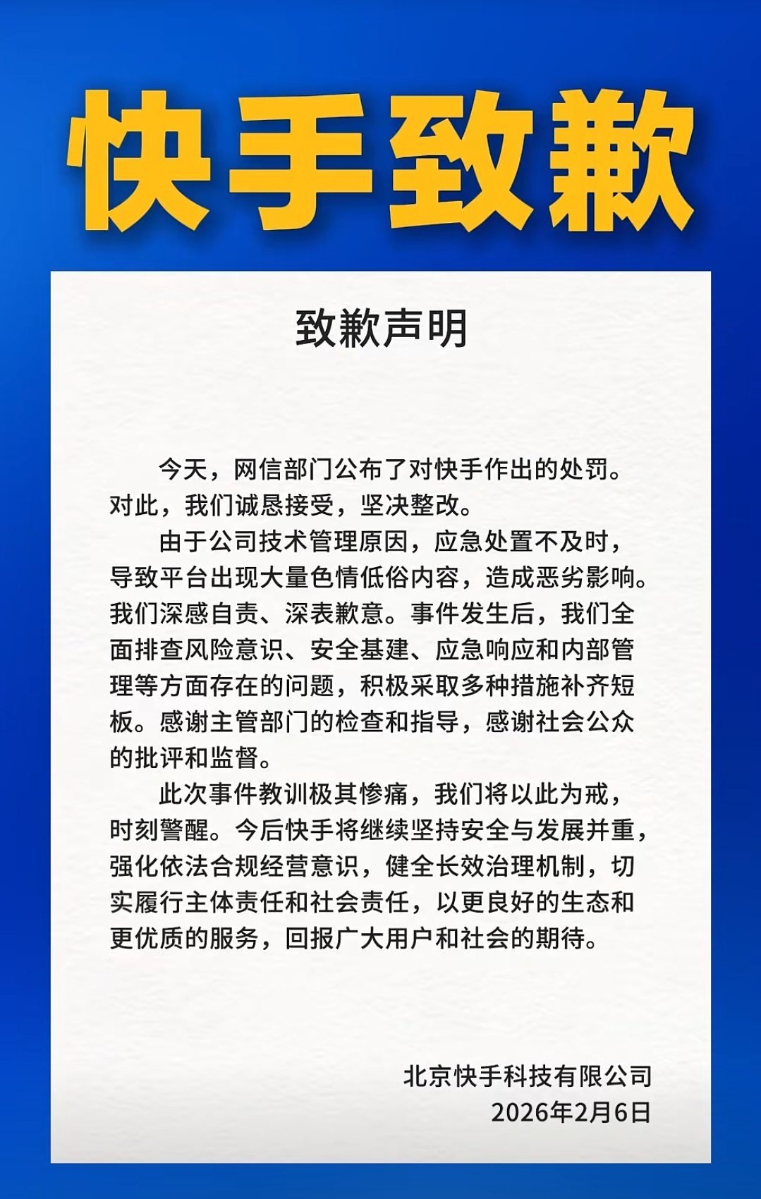 2026年2月6日,據中國新聞網消息,快手平臺因出現大量色情低俗內容直播,被北京市網信辦在國家網信辦指導下依法作出警告並罰款1.191億元的行政處罰,這一重磅罰單再次爲網絡平臺的內容治理敲響警鐘。