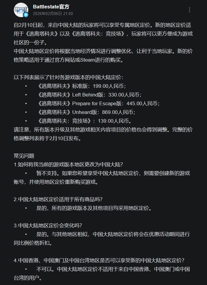 自 2026 年 2 月 10 日起,《逃离塔科夫》及《逃离塔科夫:竞技场》将正式面向中国大陆玩家推出专属地区定价策略,新的定价适用于通过游戏官方网站或 Steam 平台进行购买。