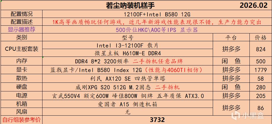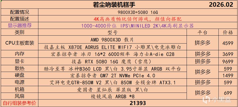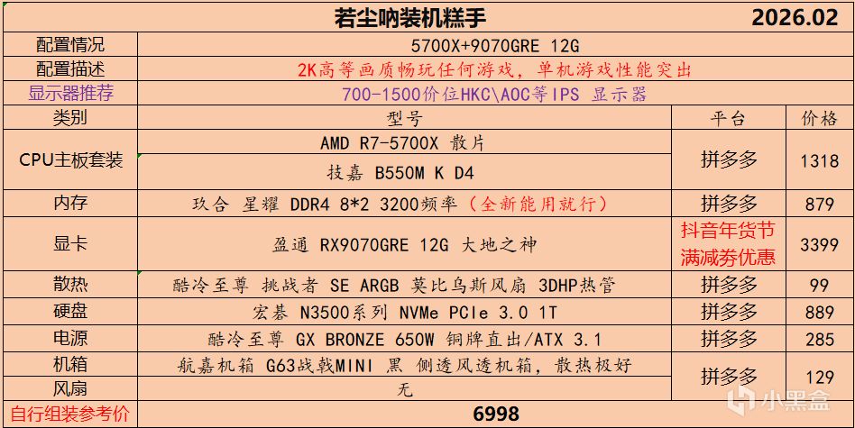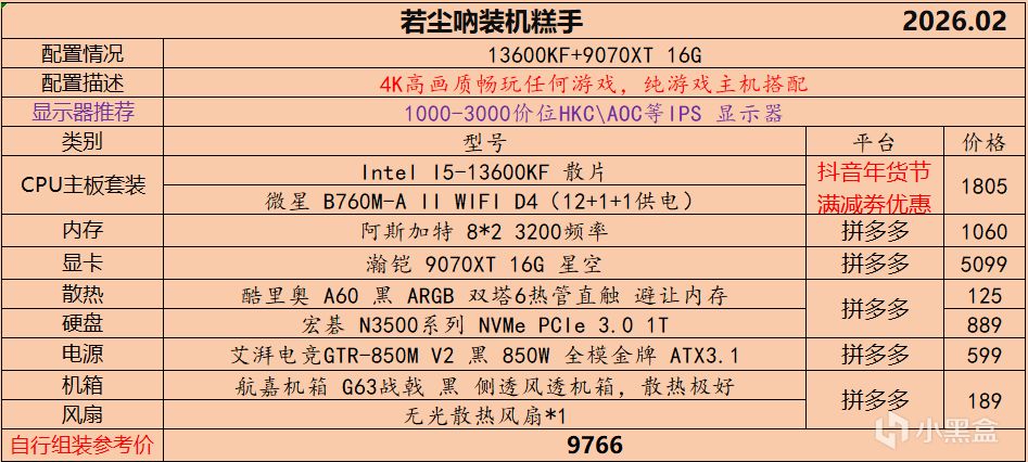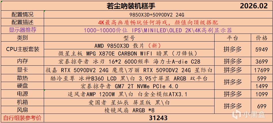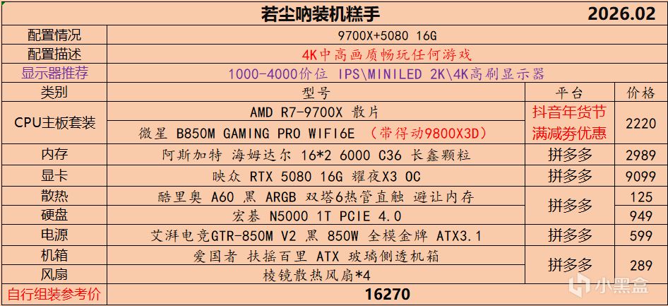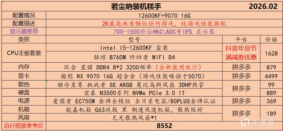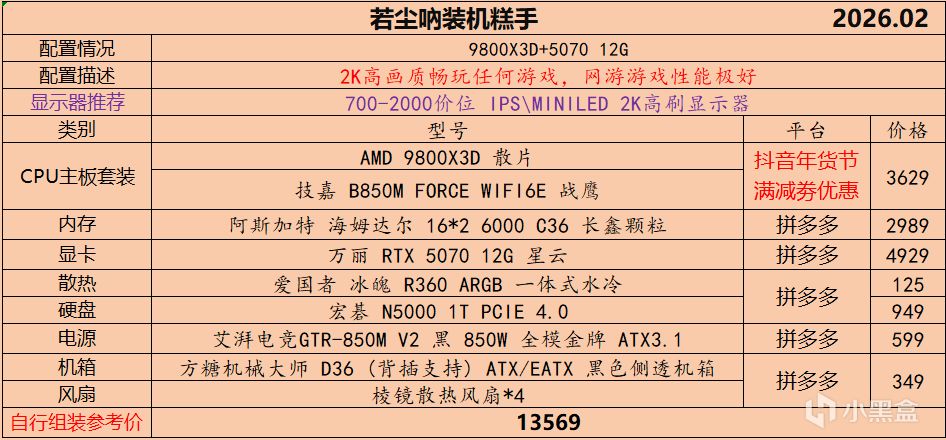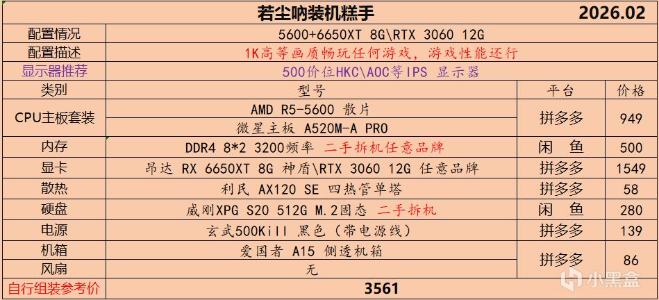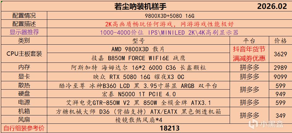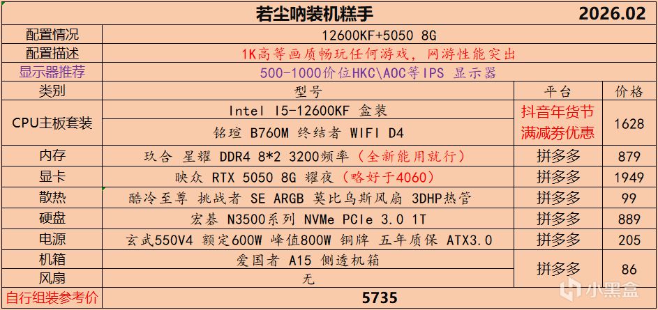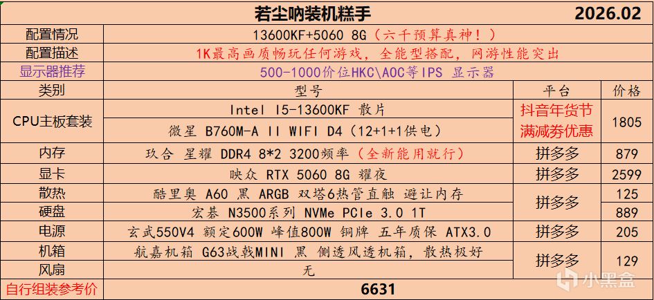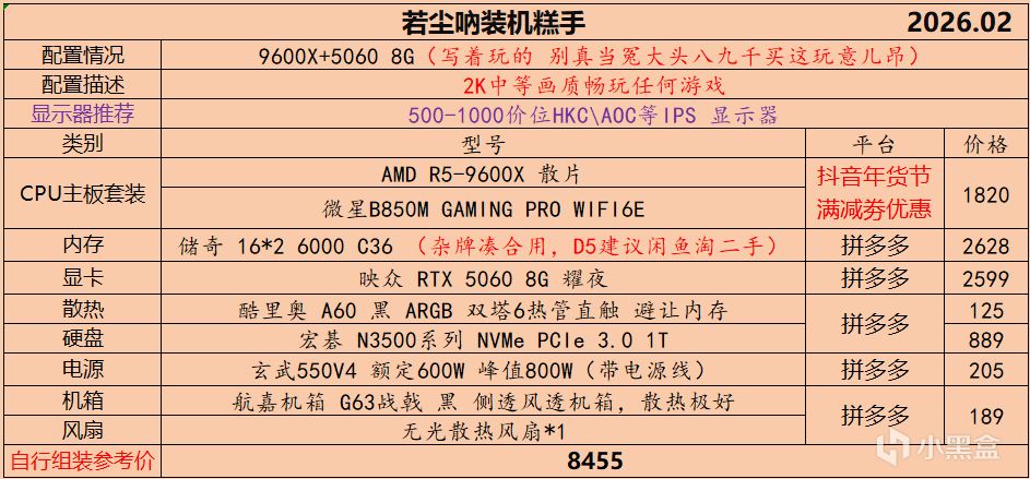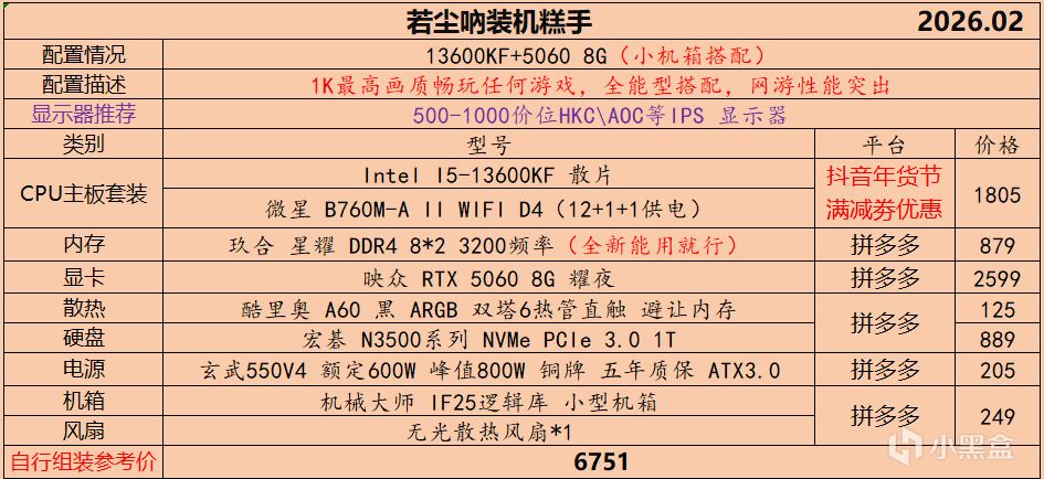 本月就先到这里吧,涨价的太厉害,一个一个找好价太费时间了,相比前些月的搭配推荐可能稍微简化了一些,最近比较忙,时间上来不及,每天也就晚上写一下,就这都搞了五六天,再往后估计还得继续涨价,推荐里面搭配肯定都是没问题的,主要还是价格波动后面会很大,盒友有什么需要的评论区直接留言即可,我会逐一回复,或者我的黑盒群聊里面都可以@我问问题。
