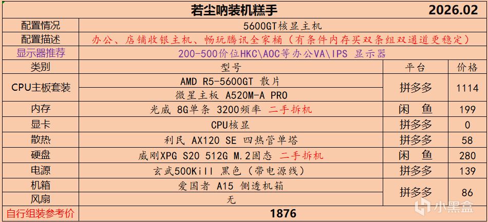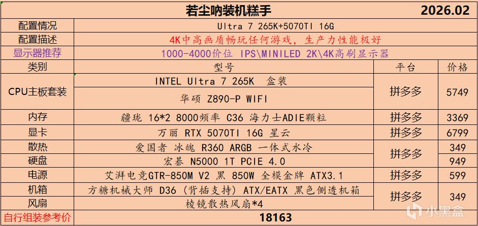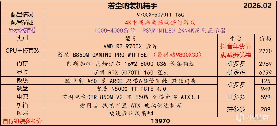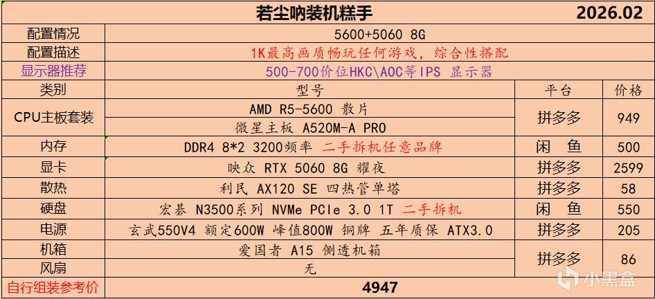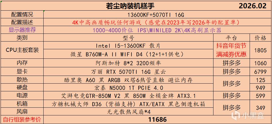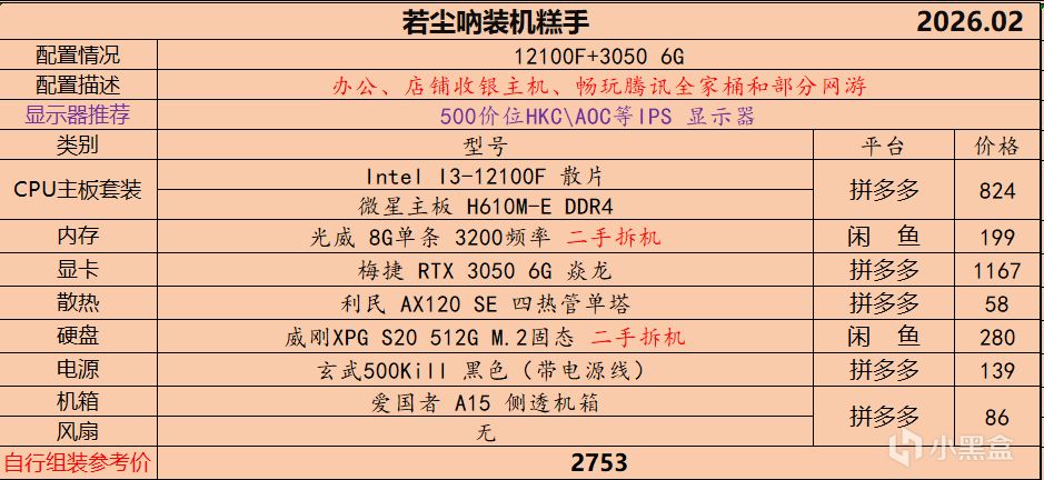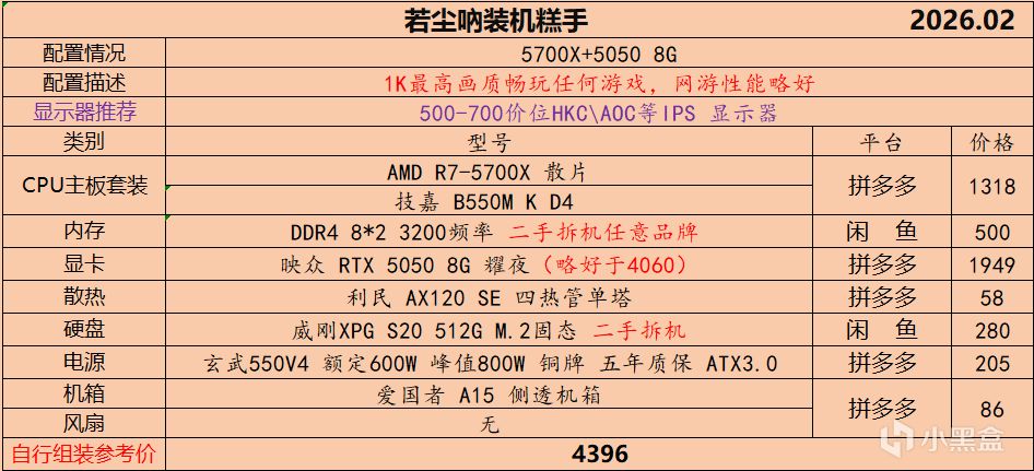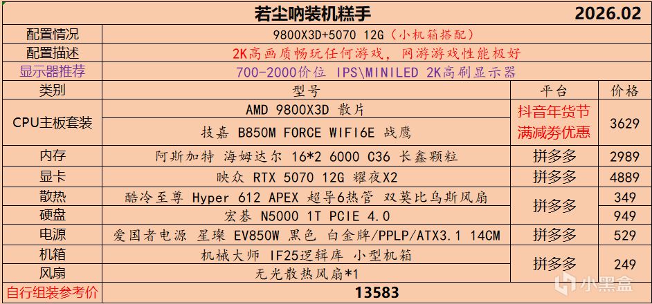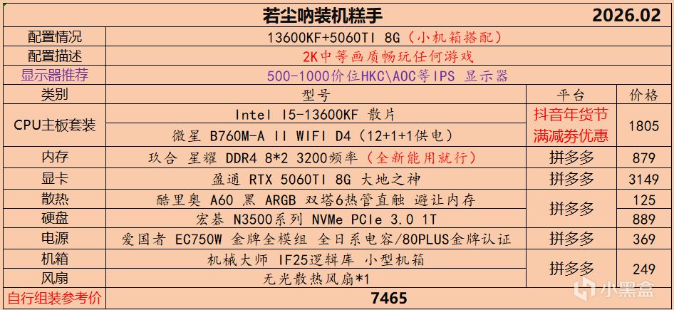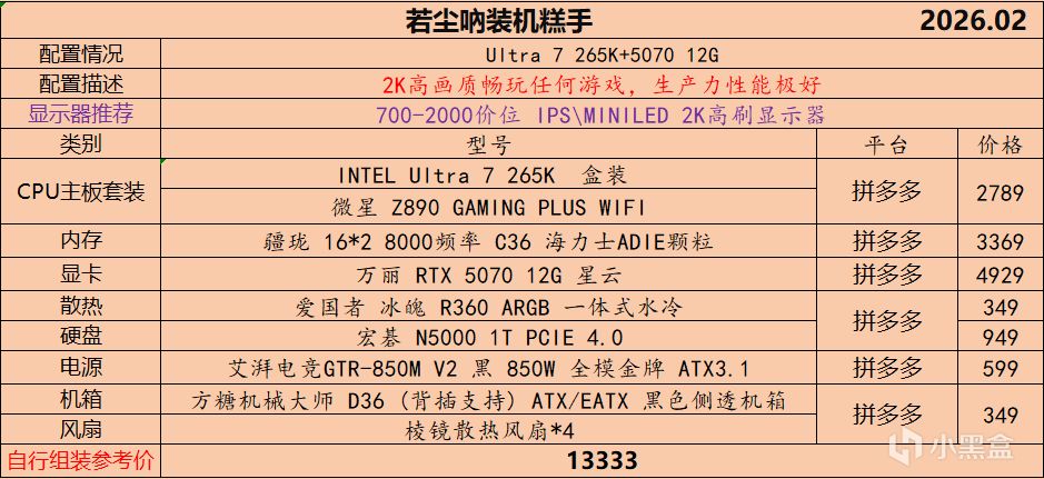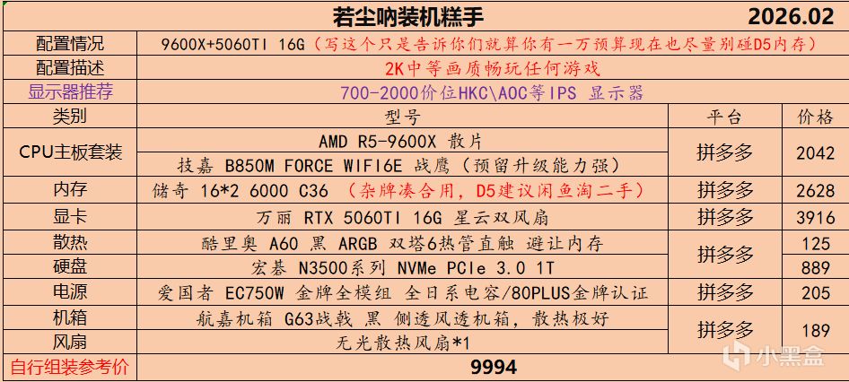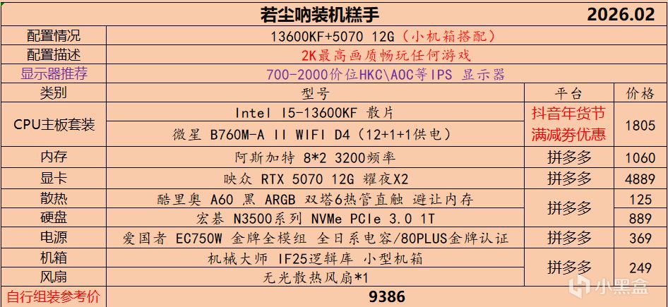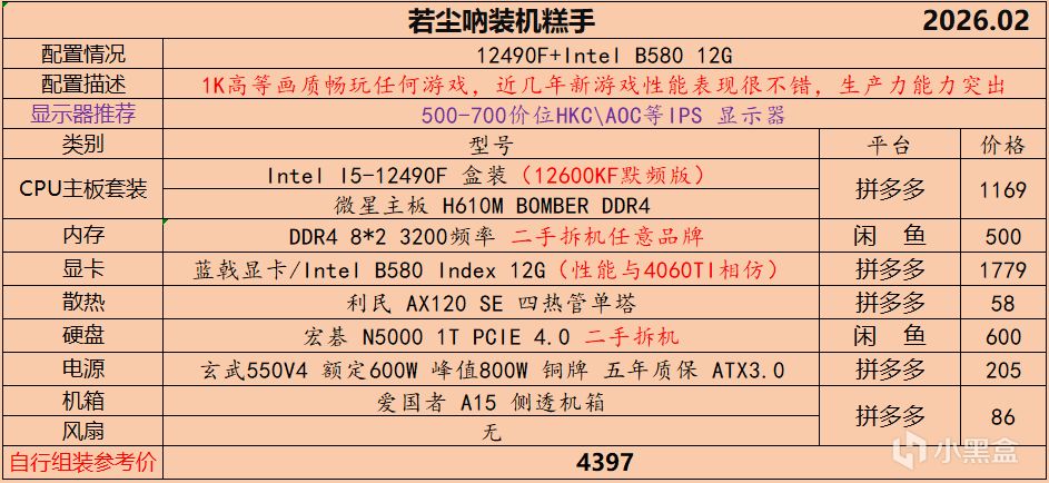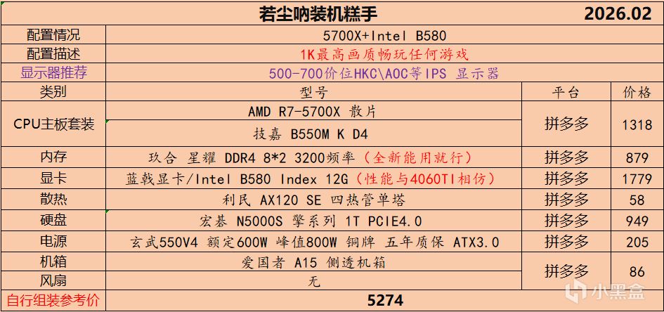 本月就先到这里吧,涨价的太厉害,一个一个找好价太费时间了,相比前些月的搭配推荐可能稍微简化了一些,最近比较忙,时间上来不及,每天也就晚上写一下,就这都搞了五六天,再往后估计还得继续涨价,推荐里面搭配肯定都是没问题的,主要还是价格波动后面会很大,盒友有什么需要的评论区直接留言即可,我会逐一回复,或者我的黑盒群聊里面都可以@我问问题。