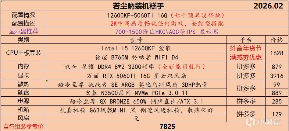 七、7000-8000预算,目前纯性能只推荐12600KF+5060TI16G,真没得挑了,可能实际购买会贵一些,不过也差不了多少: