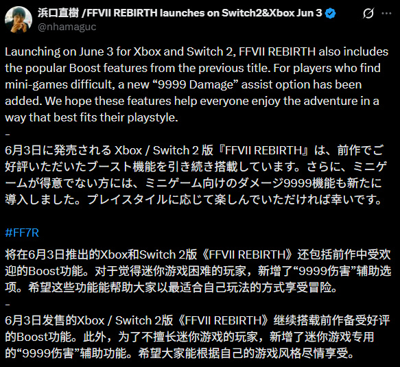 《最终幻想7:重生》将于 2026 年 6 月 3 日登陆 Xbox 及 Switch 2 平台。本次发售版本将完整包含前作备受好评的“官方修改器”辅助功能,并特别新增一项“9999伤害”辅助选项,帮助不擅长小游戏的玩家更轻松地推进冒险。