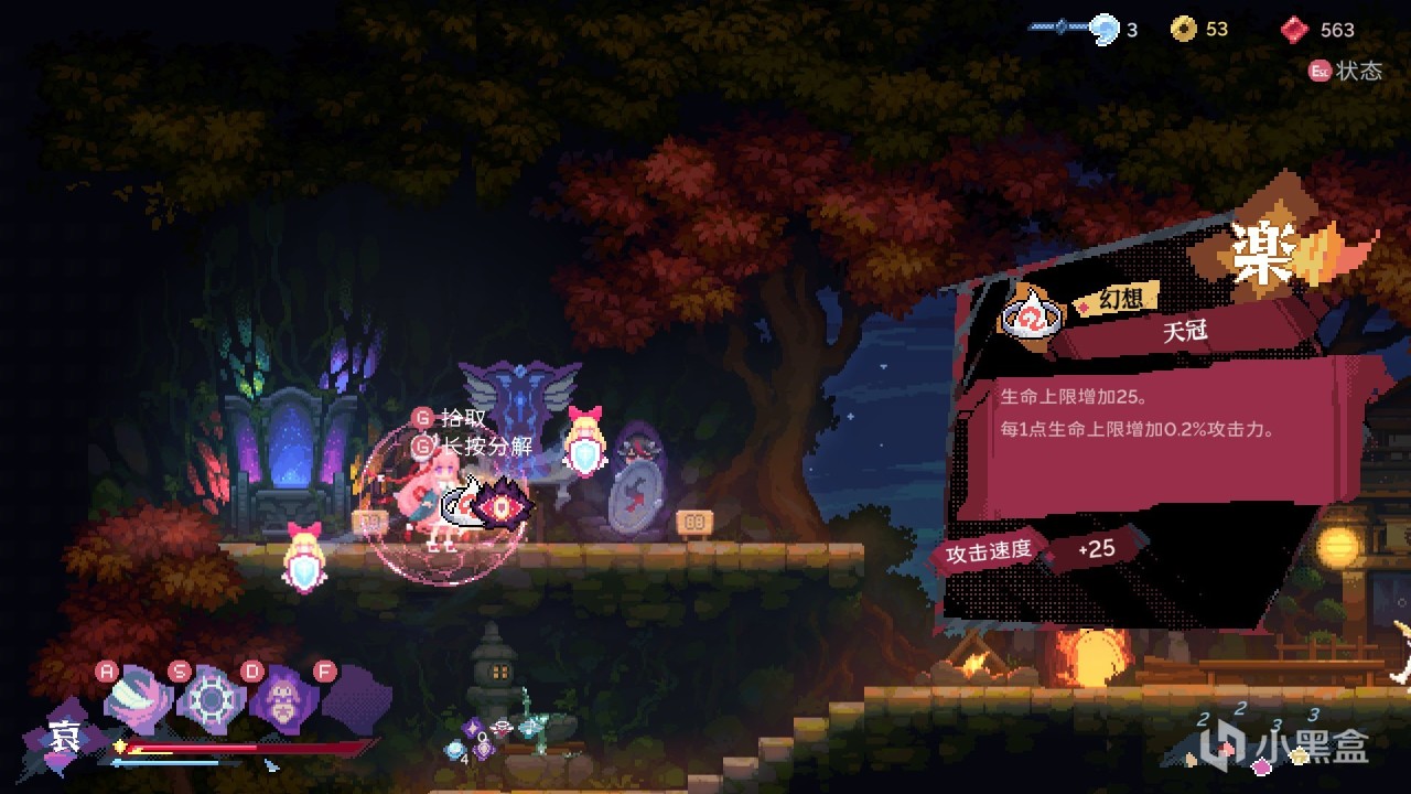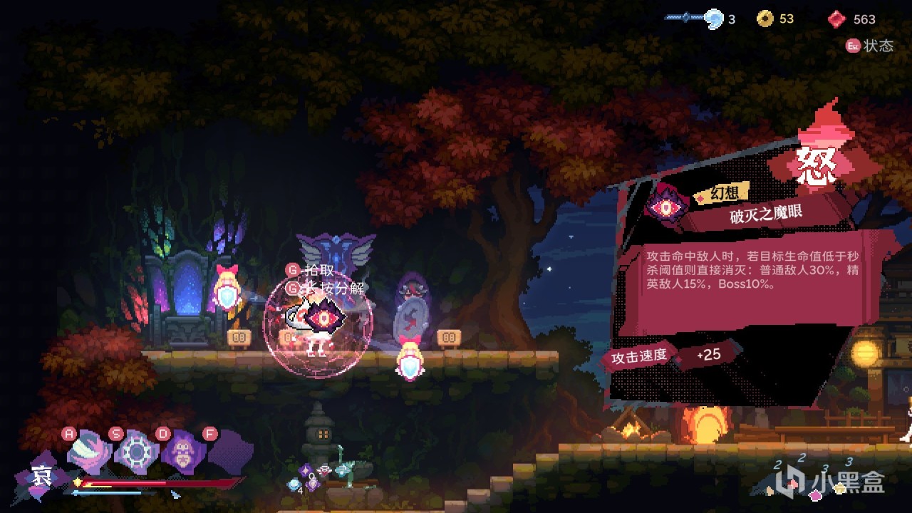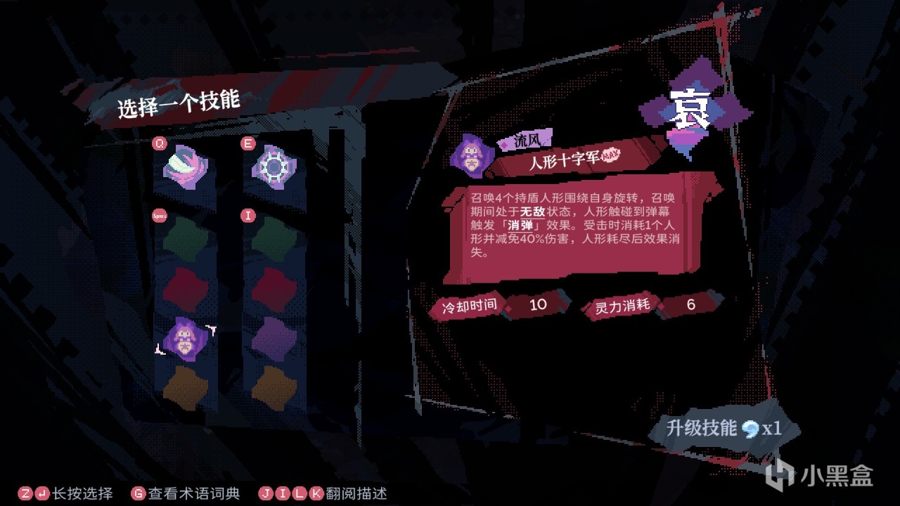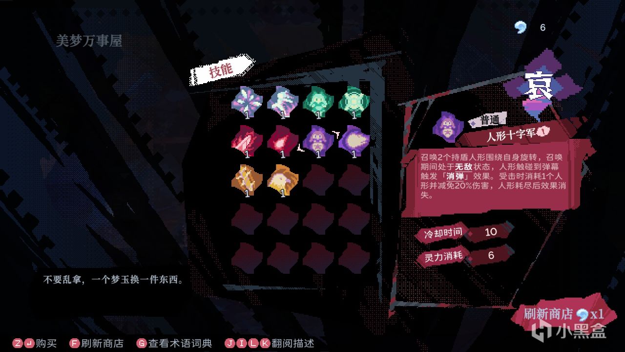 每种情绪可以携带两个技能,对于大佬来说可以携带10个技能然后炫酷华丽的嘎嘎乱杀,但对于我这种手残玩家只需要一个“人形十字军”就够了,在强化局外之后的开局进入梦境商店刷出技能,再强化技能到Max,OK游戏结束。