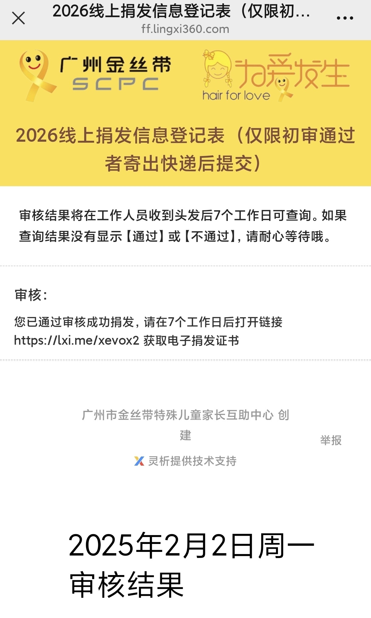 从剪下头发、妥善放好,到申请捐赠名额,再到打包进行邮寄,等审核结果,再到发放捐赠证书。
