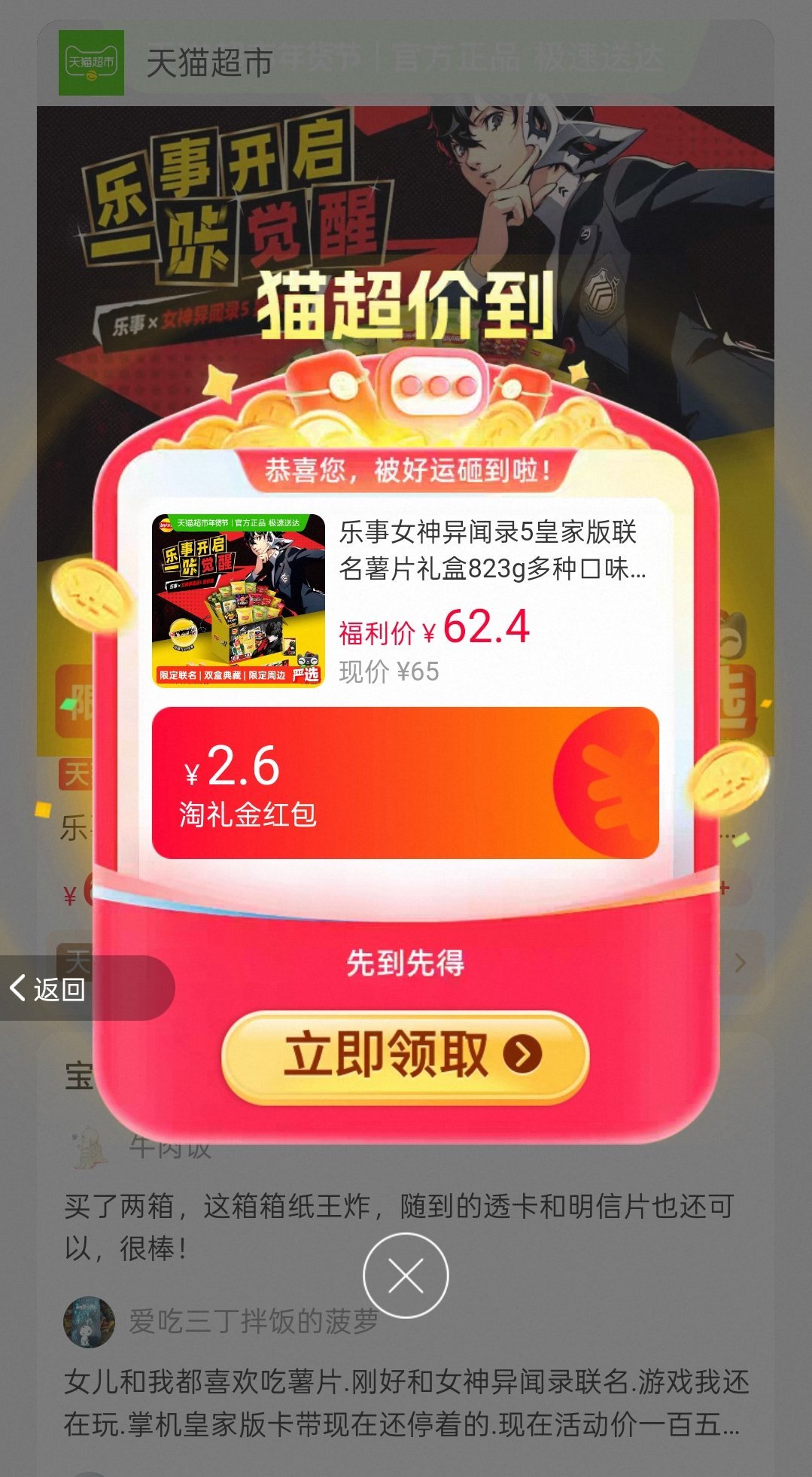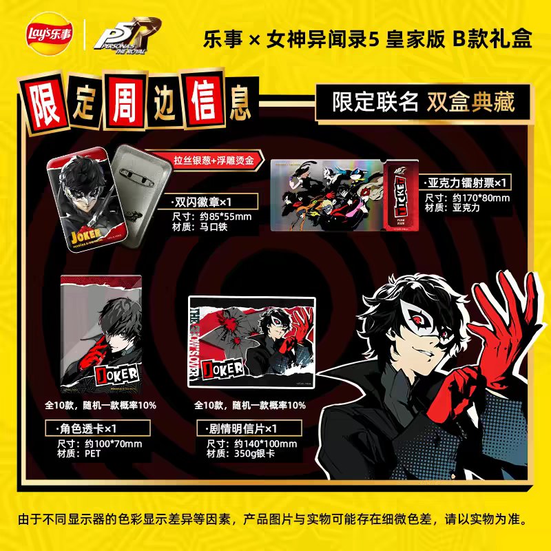 堪比前段时间乐事x初音未来神价,原价129元的乐事联名P5R礼盒,前段时间半价64元卖断货了,今天补货搭配淘宝官方福利礼金(目前概率能刷到),以及淘金币和88VIP会员卷可以做到50元史低价格!
