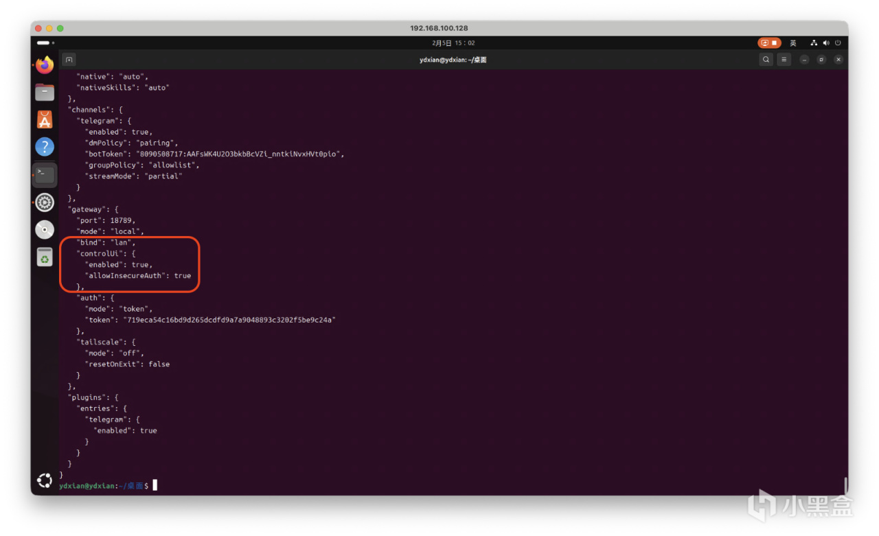 allowInsecureAuth: true允許在不安全的 HTTP 連接下進行認證(因爲是內網訪問 192.168.100.128:18789,不是 https)