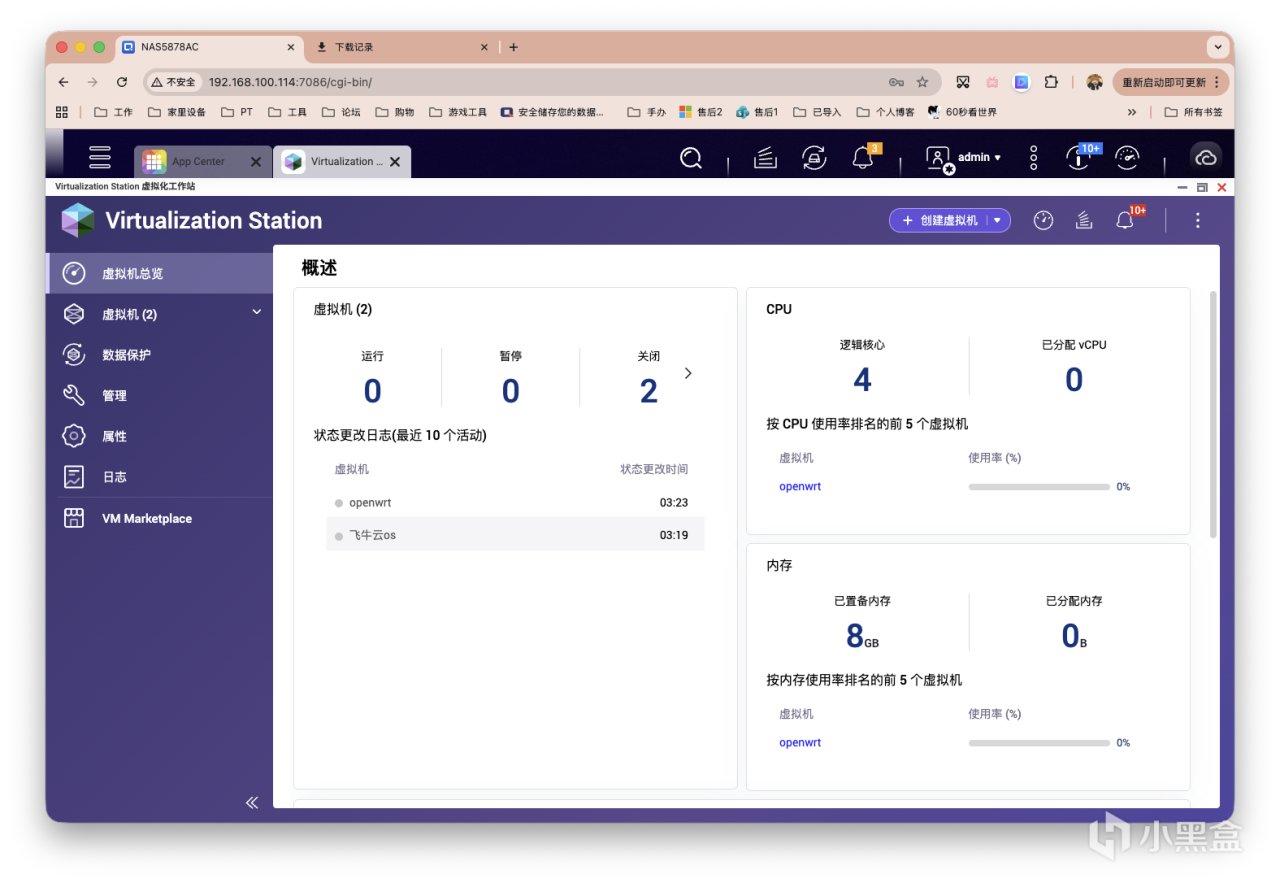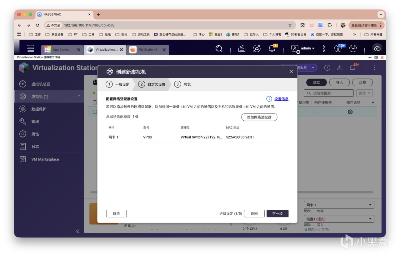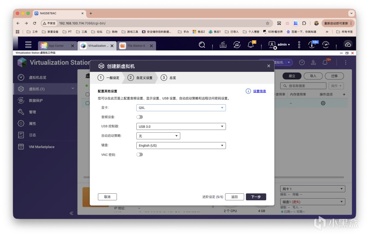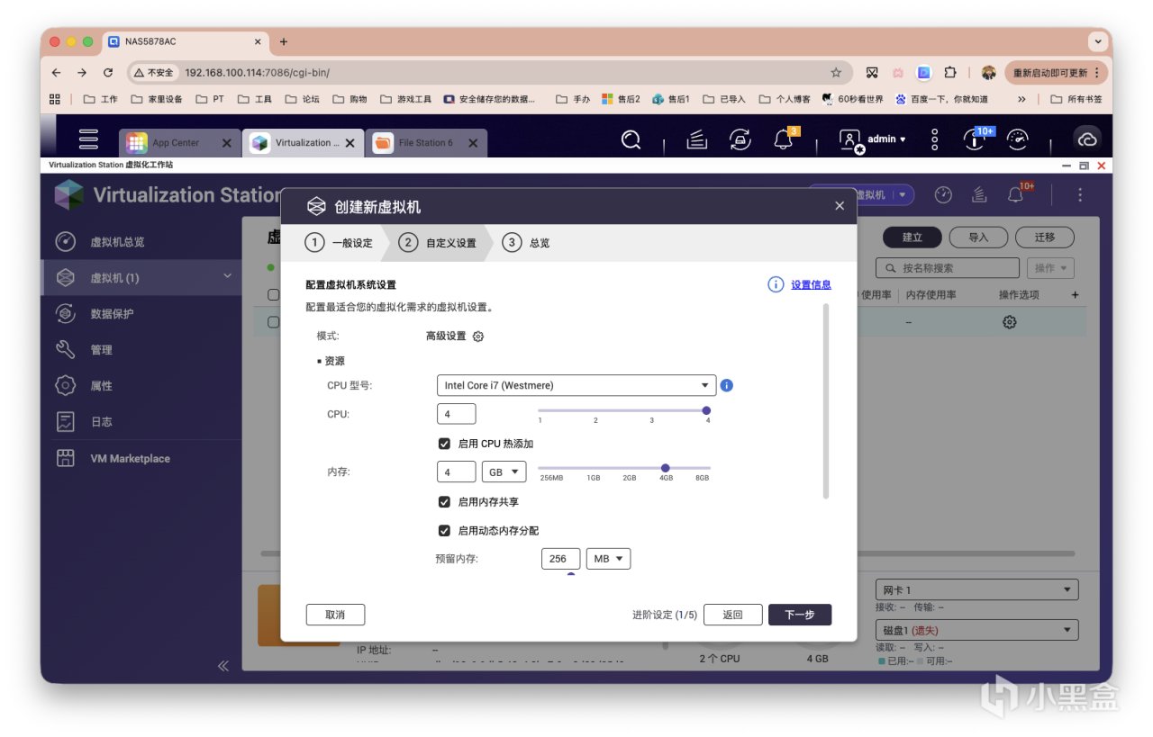 接着進行硬件分配,建議CPU、內存都給個4,不過好在威聯通的虛擬機支持內存共享和動態分配,CPU也能熱調整,大家後續可動態調整。