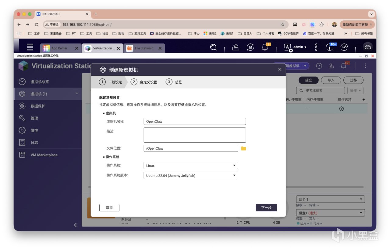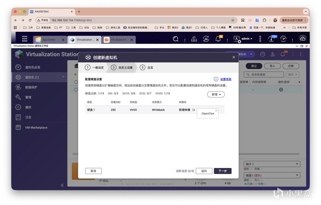 然後添加硬盤,大部分保持默認即可,映像檔新建並選擇共享文件夾「OpenClaw」。