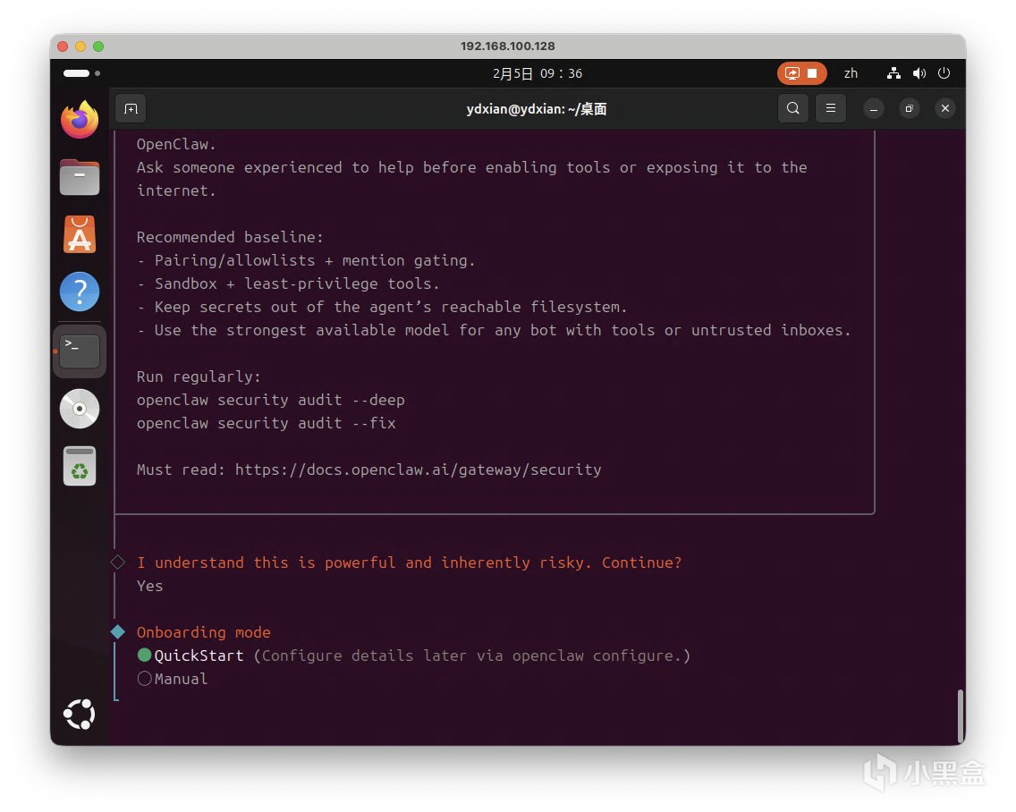 更新完了再次執行上面的OpenClaw安裝指令。等待安裝,第一個確認窗口如下。其實就是使用協議,一些可能帶來的安全風險和使用須知,OpenClaw 能讀取本機文件並執行操作(高自由度),這也是我目前爲啥不建議部署在你的主力電腦上。鍵盤方向鍵選擇「Yes」並回車。
