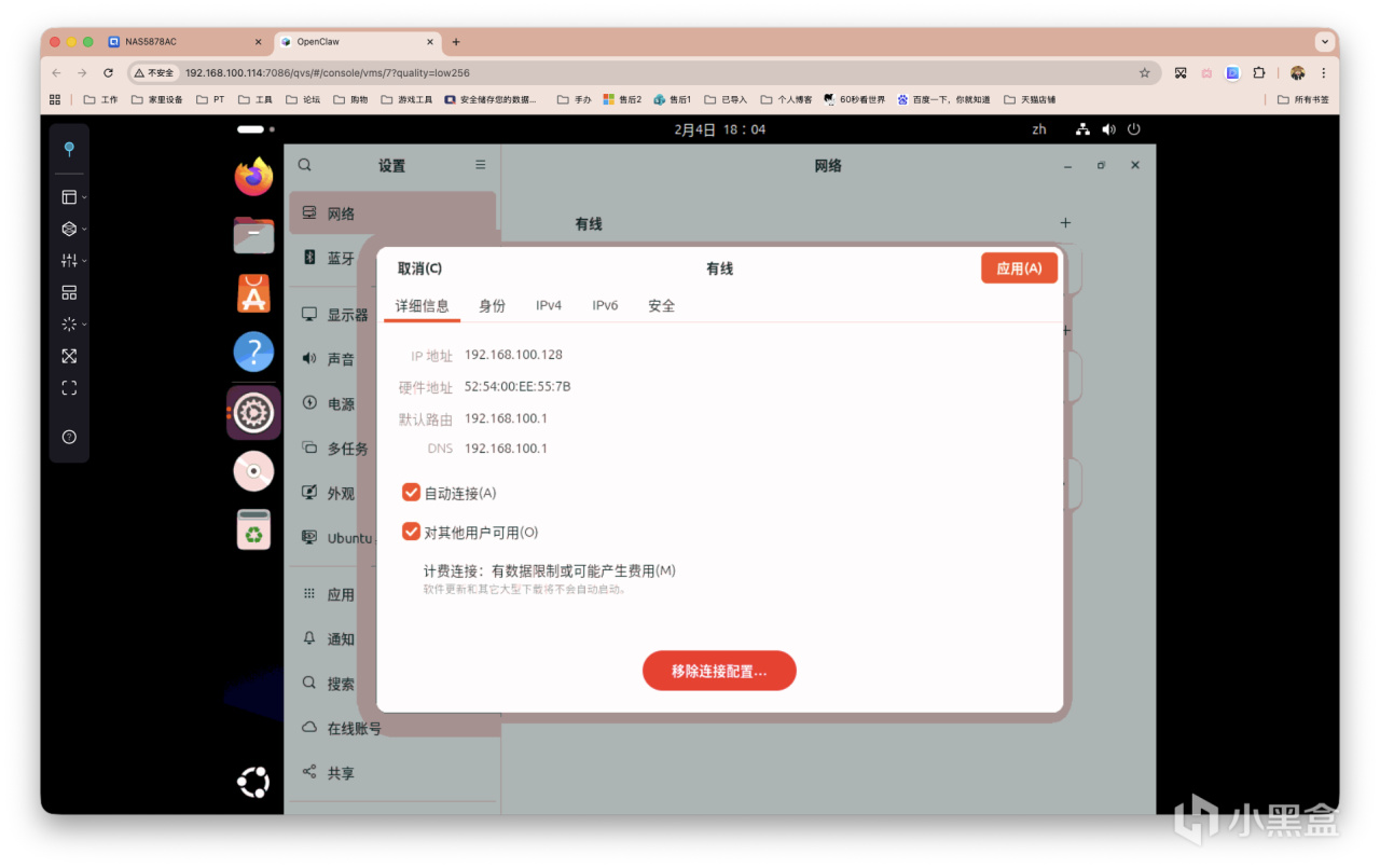 打開ubuntu的設置界面,左側欄第一個「網絡」,查看本機IP,我這臺爲192.168.100.128。