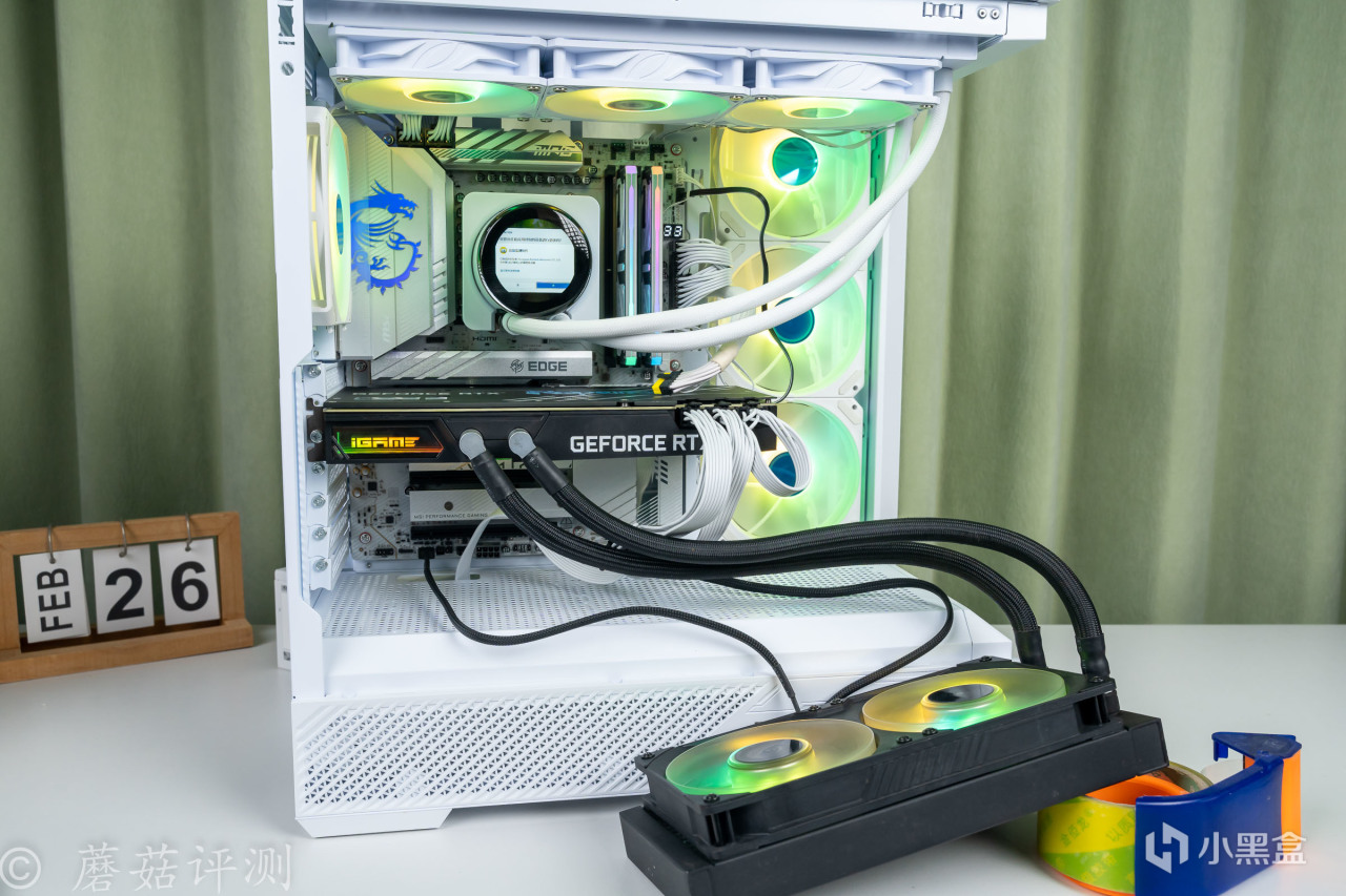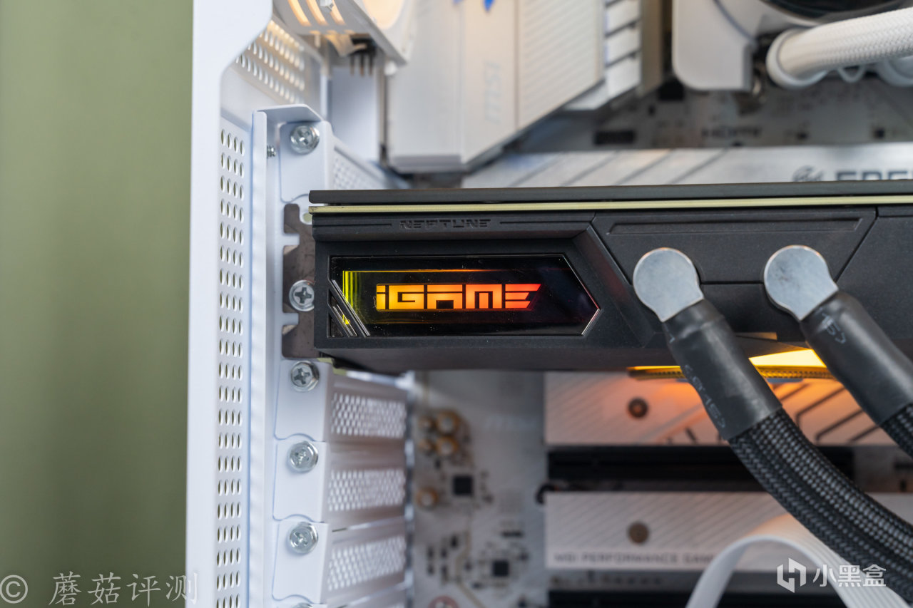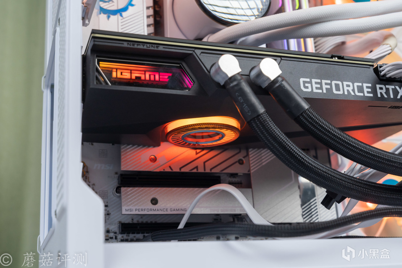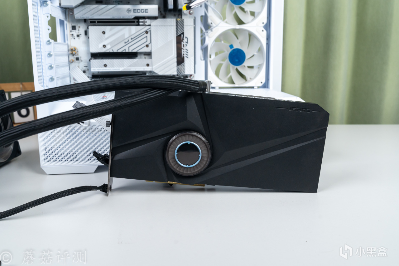 最後再多聊一句,蘑菇之前沒用過水冷卡,這次體驗之後發現真不錯。即使是50%的冷排風扇轉速,日常玩遊戲的噪音、溫度表現也要明顯低於很多風冷卡。只不過,其對於機箱的要求比較高,不僅要有足夠的水冷排安裝位置,而且其特殊的越肩設計,再加上水冷管,需要的機箱內部橫向空間十分充足。普通機箱肯定是別想了,能支持豎裝顯卡的機箱可以嘗試下。