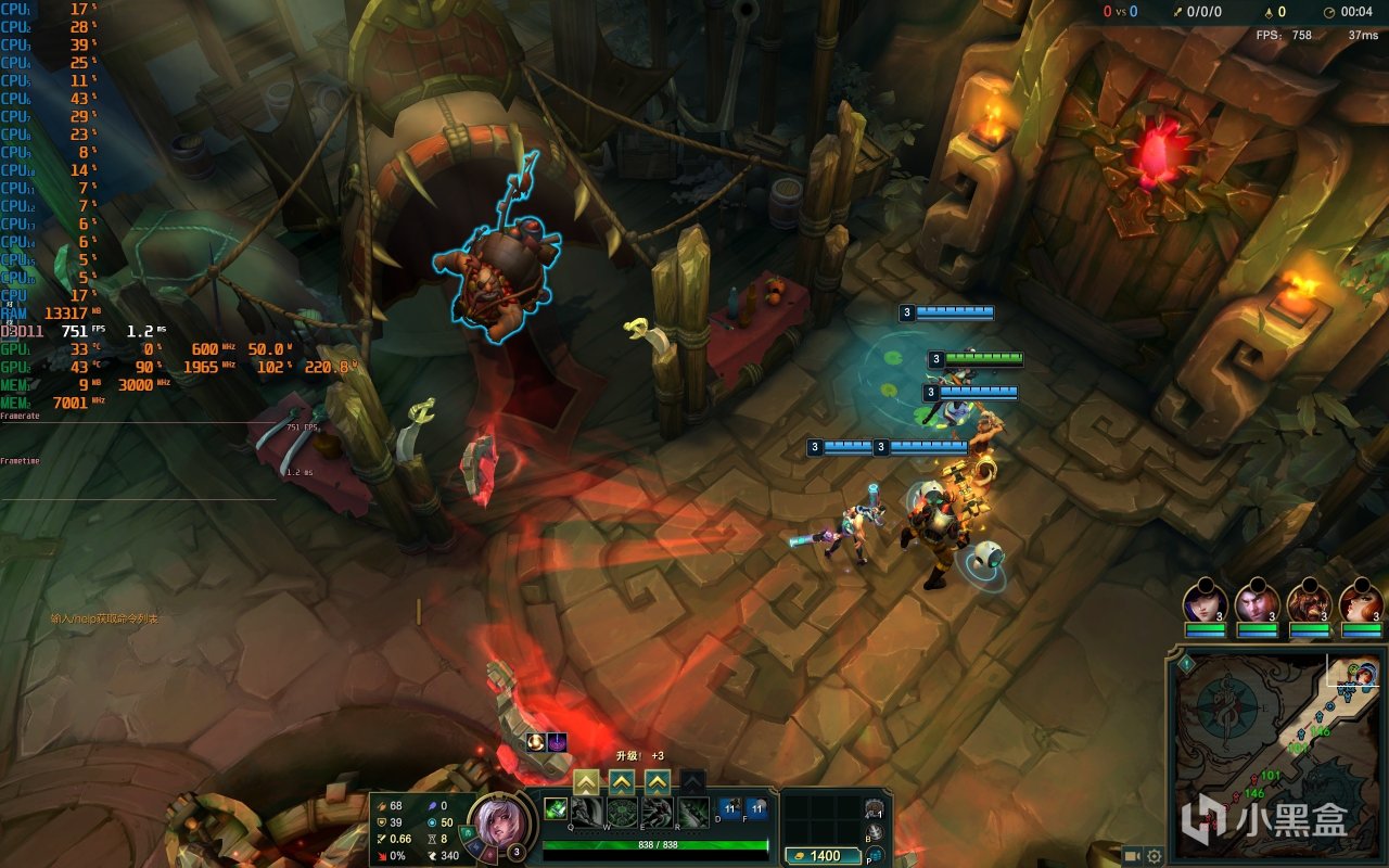 ▼LOL大亂鬥模式,2K分辨率,全極高畫質,泉水遊戲幀數在751幀左右,非常流暢。