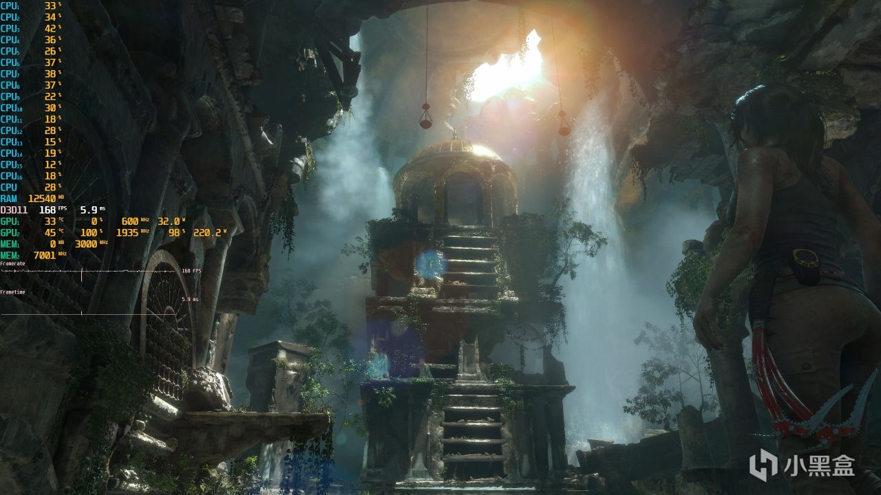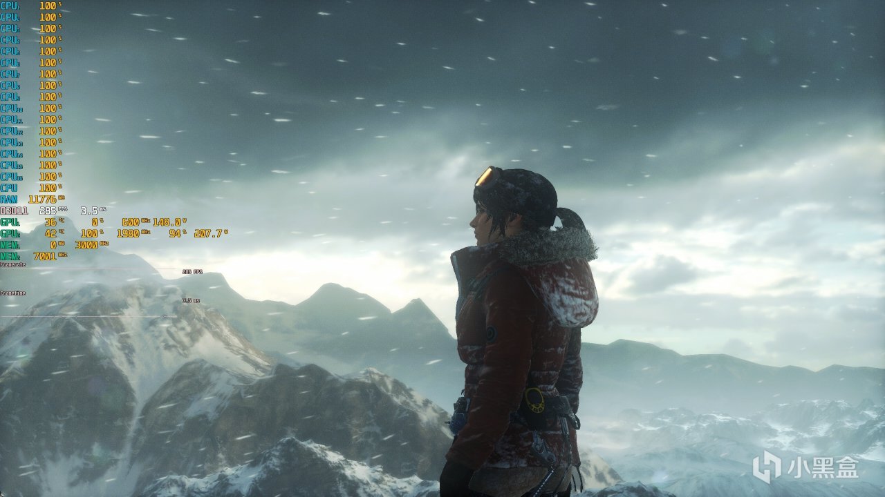 ▼古墓麗影,2K分辨率,全高畫質,第一個測試場景,遊戲幀數在285幀左右,顯卡佔用100%。