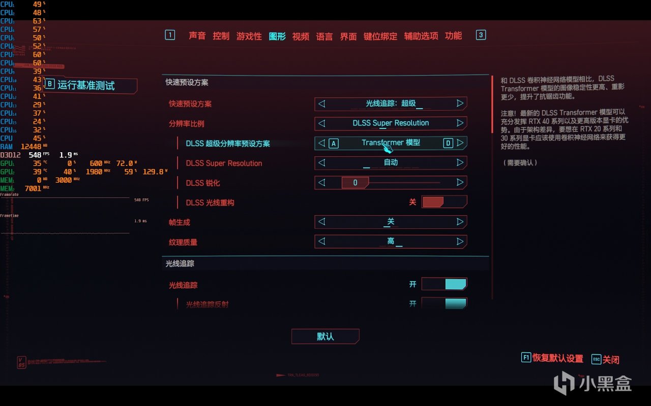 ▼賽博朋克2077,光追超級畫質,大力水手DLSS自動,拼好幀關閉。