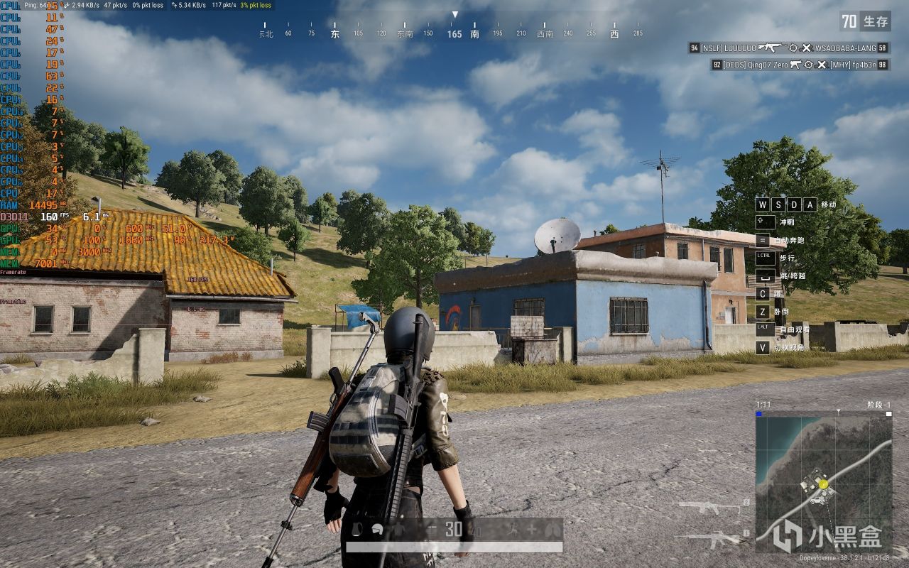 ▼絕地求生PUBG,2K分辨率,全高畫質,室外遊戲幀數在160幀左右,顯卡佔用100%,功耗217W左右,溫度53℃。