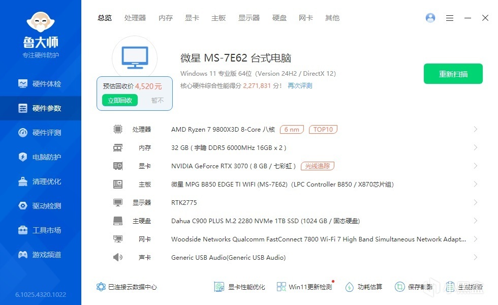 ▼簡單看下整機配置,處理器是9800X3D,可以讓這張RTX 3070充分發揮性能。