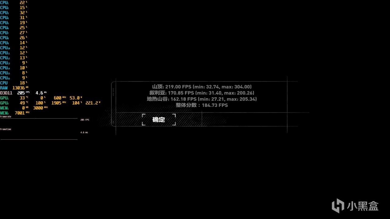 ▼最後整體的平均遊戲幀數在184.73幀左右,還是非常流暢的。