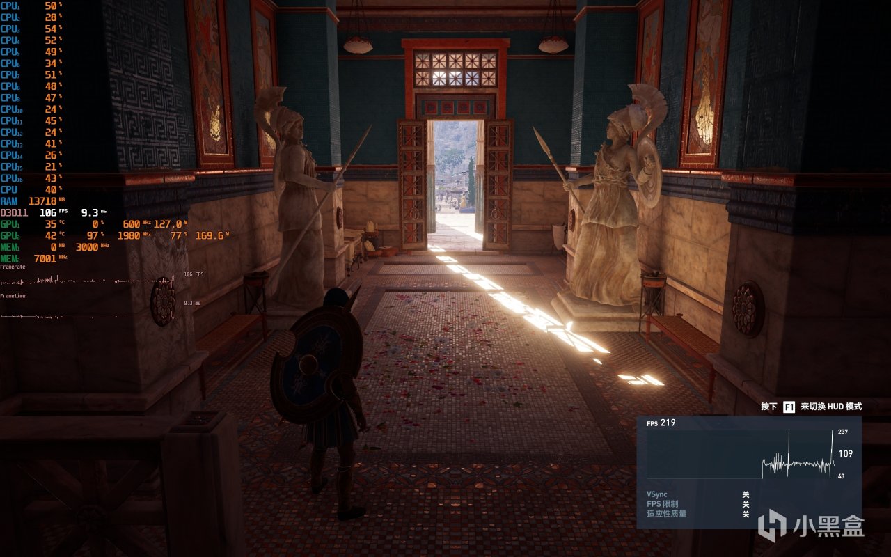 ▼衆生平等奧德賽,2K分辨率,極高畫質,體積雲最低,走廊遊戲幀數在106幀左右,顯卡佔用97%。