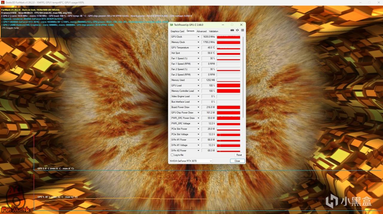 ▼把風扇轉速拉到100%,顯卡核心溫度降到48.5℃,熱點溫度58.8℃,降溫明顯。