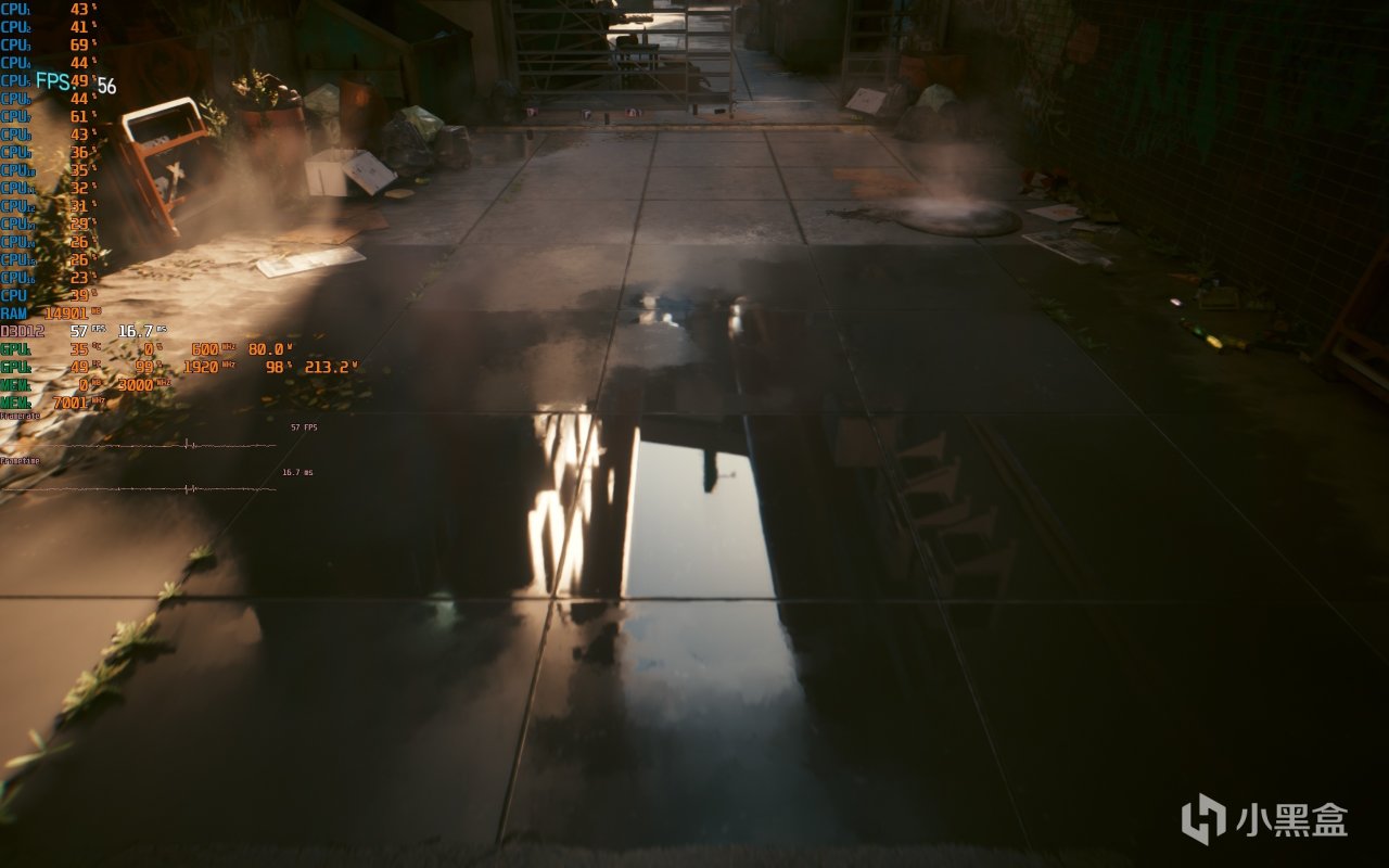▼室外水灘的光影效果非常不錯,水面的倒影很真實,遊戲幀數在57幀左右,顯卡佔用99%。
