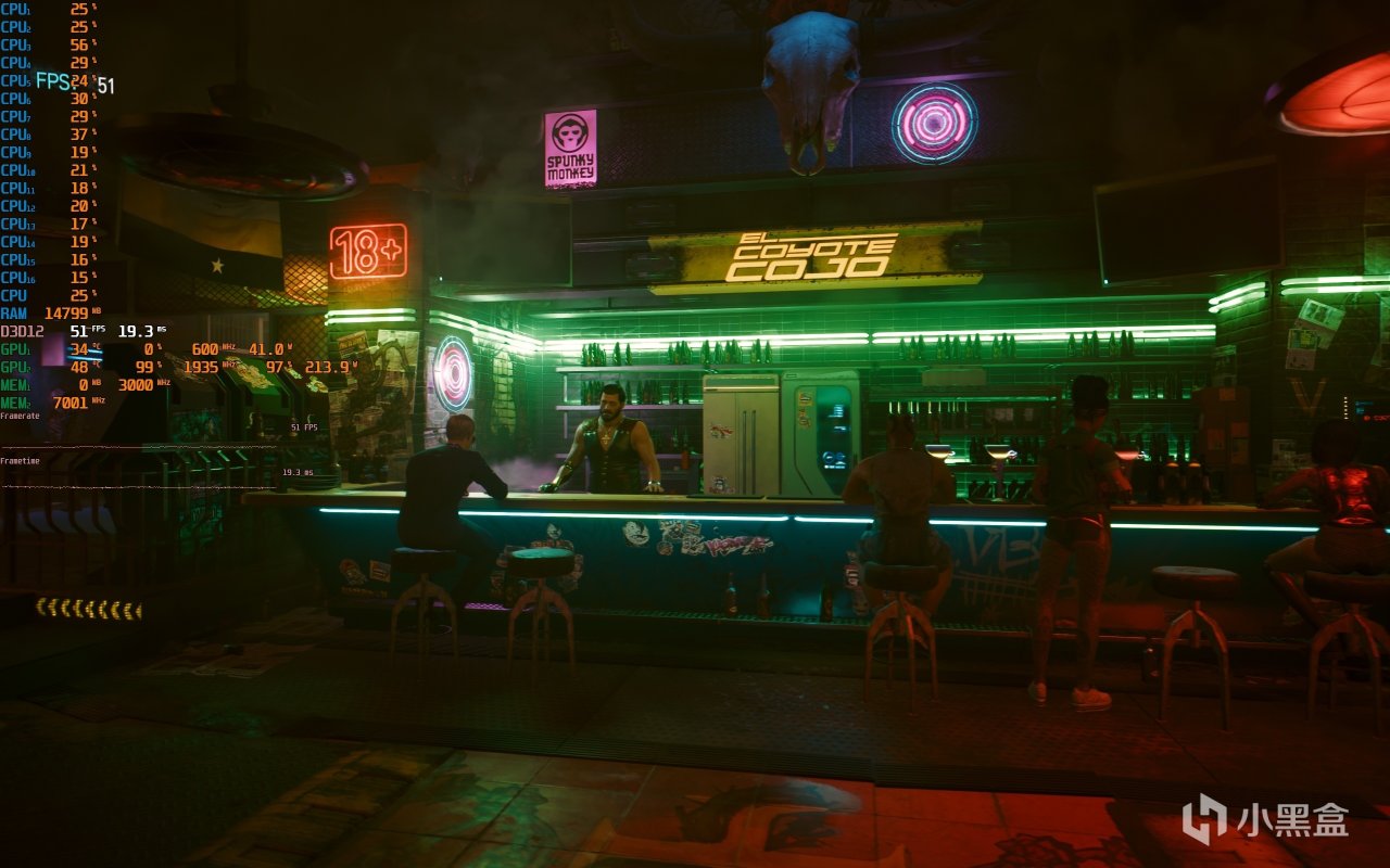 ▼酒吧吧檯的遊戲幀數在51幀左右,這個畫質特效,對RTX 3070這張顯卡來說,有點超出能力了。
