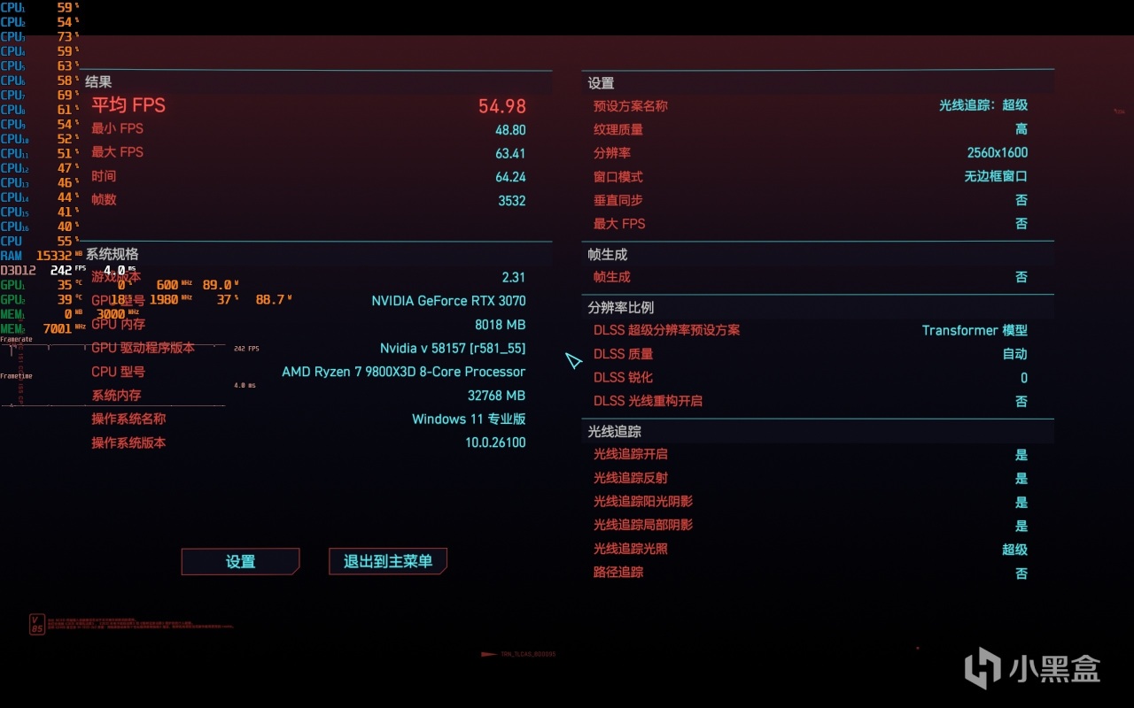 ▼最後整體的遊戲幀數在54.98幀左右,很接近60幀了,表現還不錯了,說實話,畢竟這是光追超級畫質。