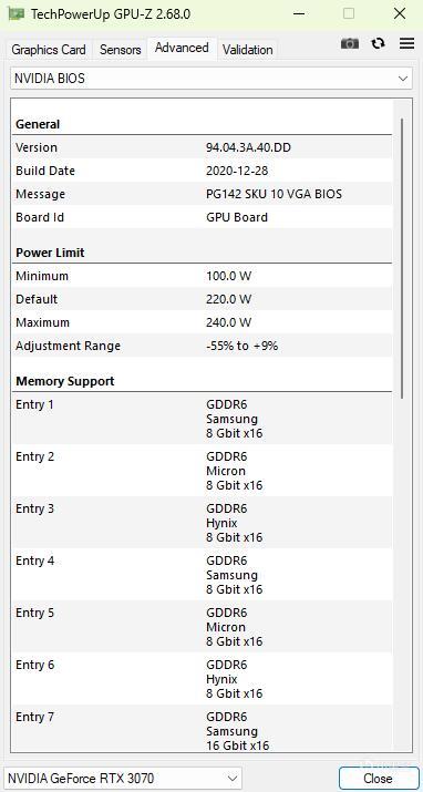 ▼顯卡的默認功耗在220W左右,最大功耗在240W左右,和常規的RTX 3070顯卡一樣,並沒有因爲水冷散熱模組,就給一個比較誇張的功耗,有點意外。
