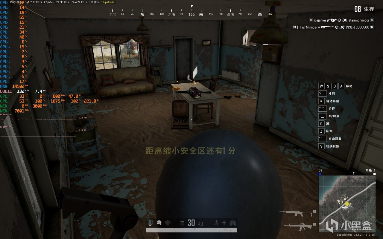 ▼室內遊戲幀數在132幀左右,顯卡佔用100%,功耗221W,溫度53℃。