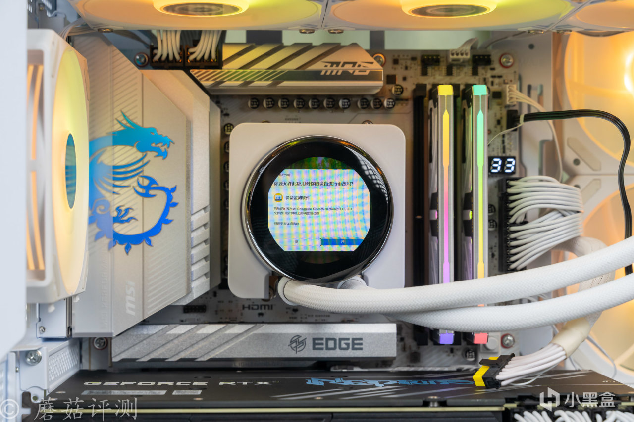 ▼水冷是微星的冰曜P13,這款水冷的水冷頭標配一塊2.1英寸的LCD屏幕,可以作爲副屏使用,這裏開機就直接顯示在水冷頭上了,哈哈。