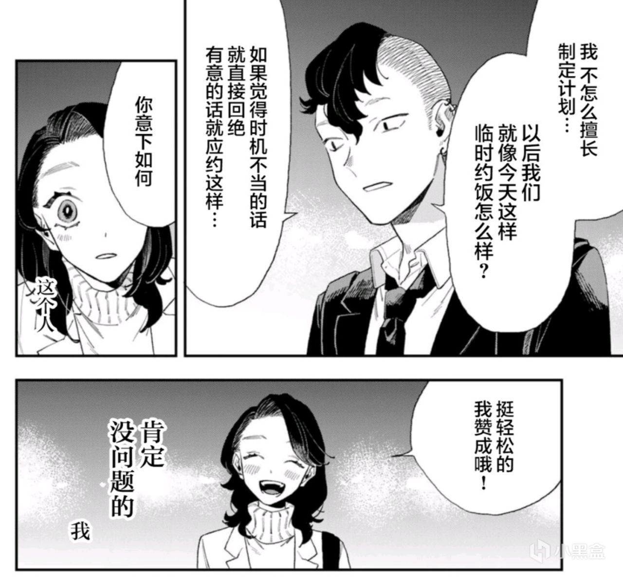 随着漫画进程的深入,二人虽然依然维持着饭搭子的关系,但可以很明显看出二人之间的距离也在逐渐被拉进——话题从工作开始慢慢涉及个人生活,谈话从一开始略带拘谨到后来几乎无话不谈,甚至到了30话二人已经开始慢慢接触到对方的社交圈子……