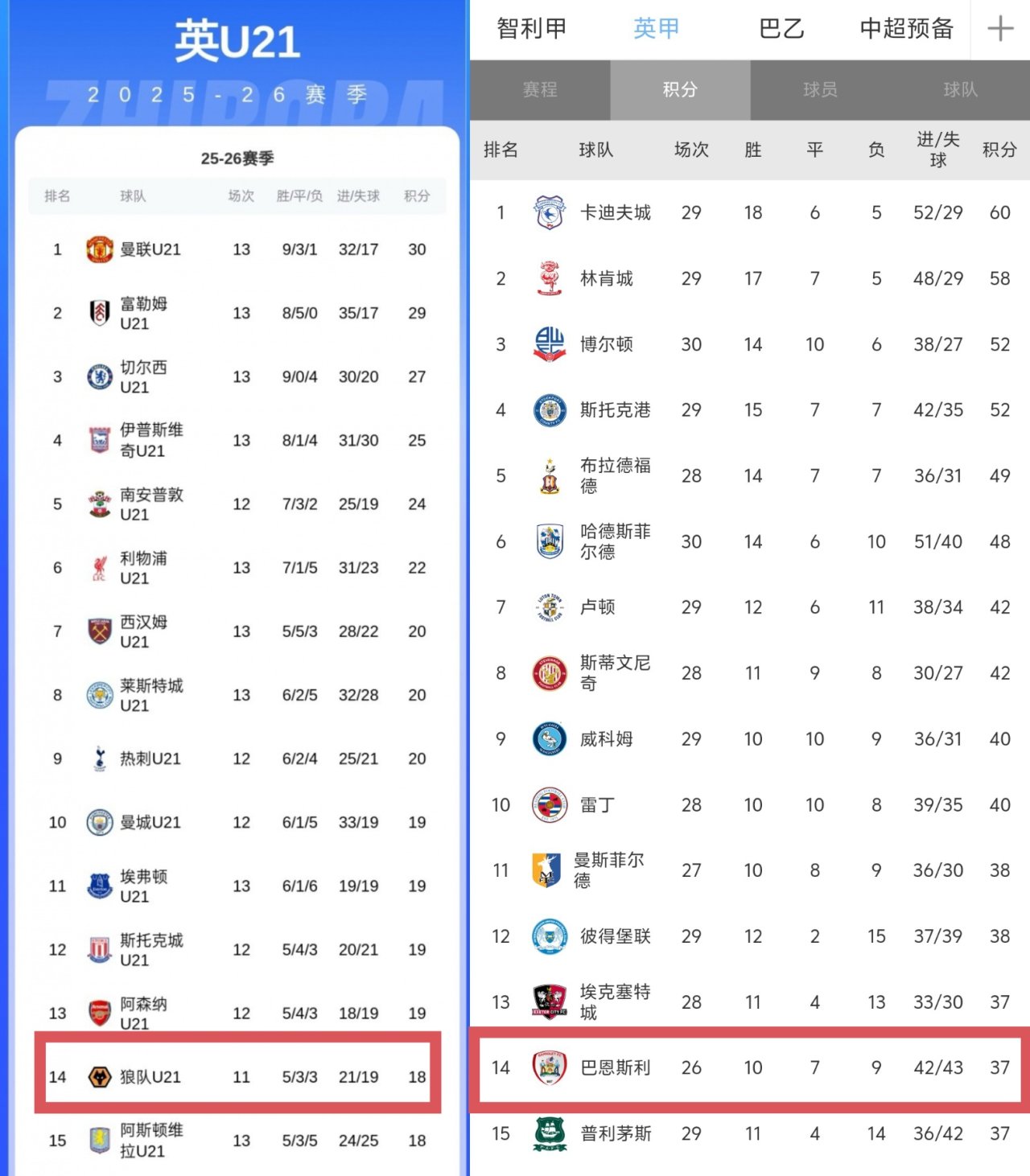 此外巧合的是,目前狼队U21和巴恩斯利都排在联赛的第14位。