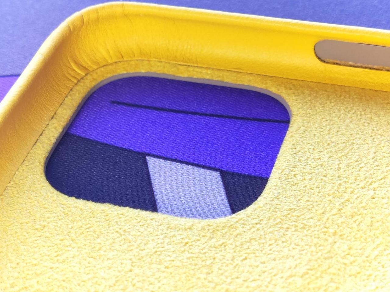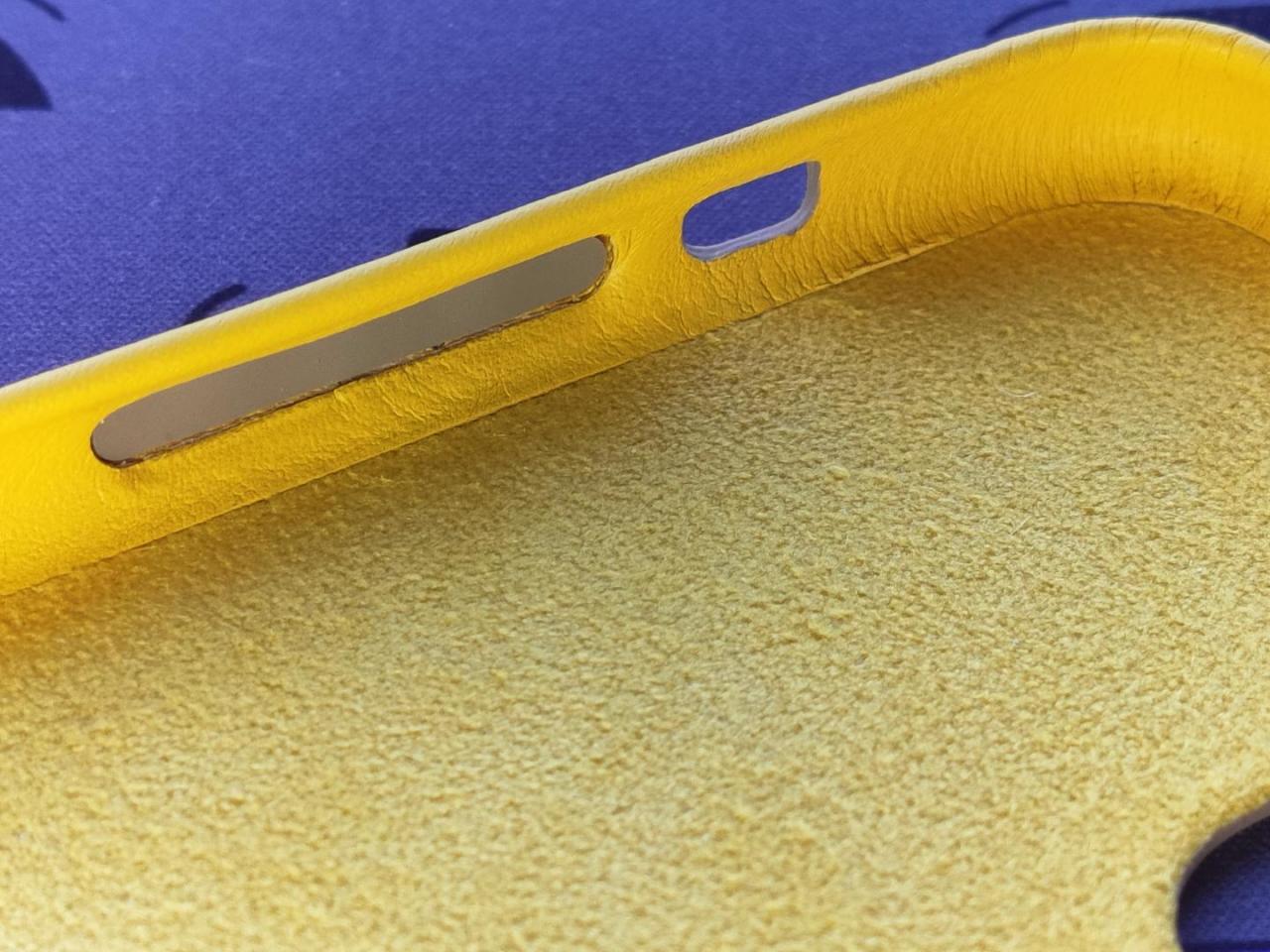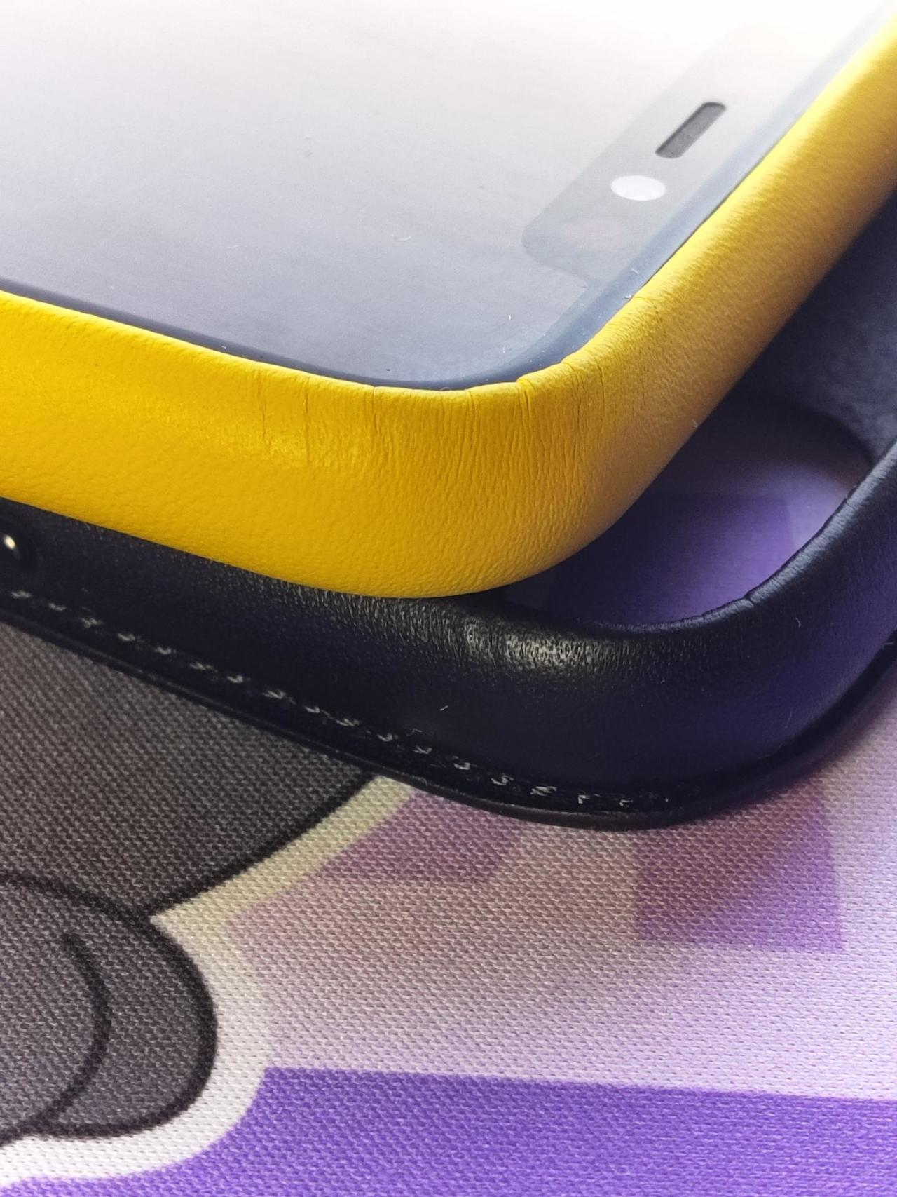 这个皮革保护套看似是上文皮革翻盖保护套的“减配”板,实则不然。这个黄色的皮革保护套是要比翻盖的厚的,貌似是中间多夹了一层塑料。这点可以从相机开孔的切边看出,因为这里并没有封边。