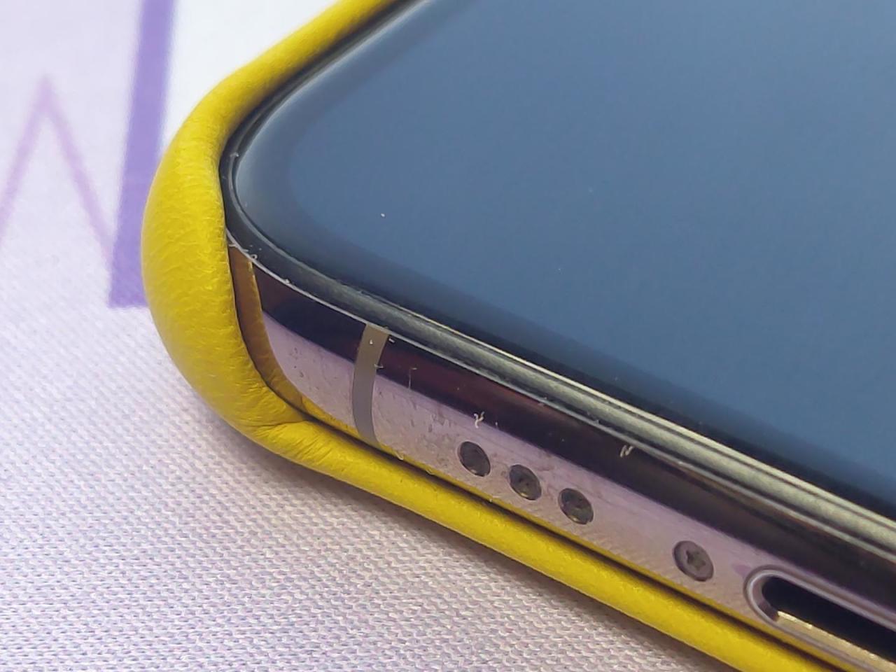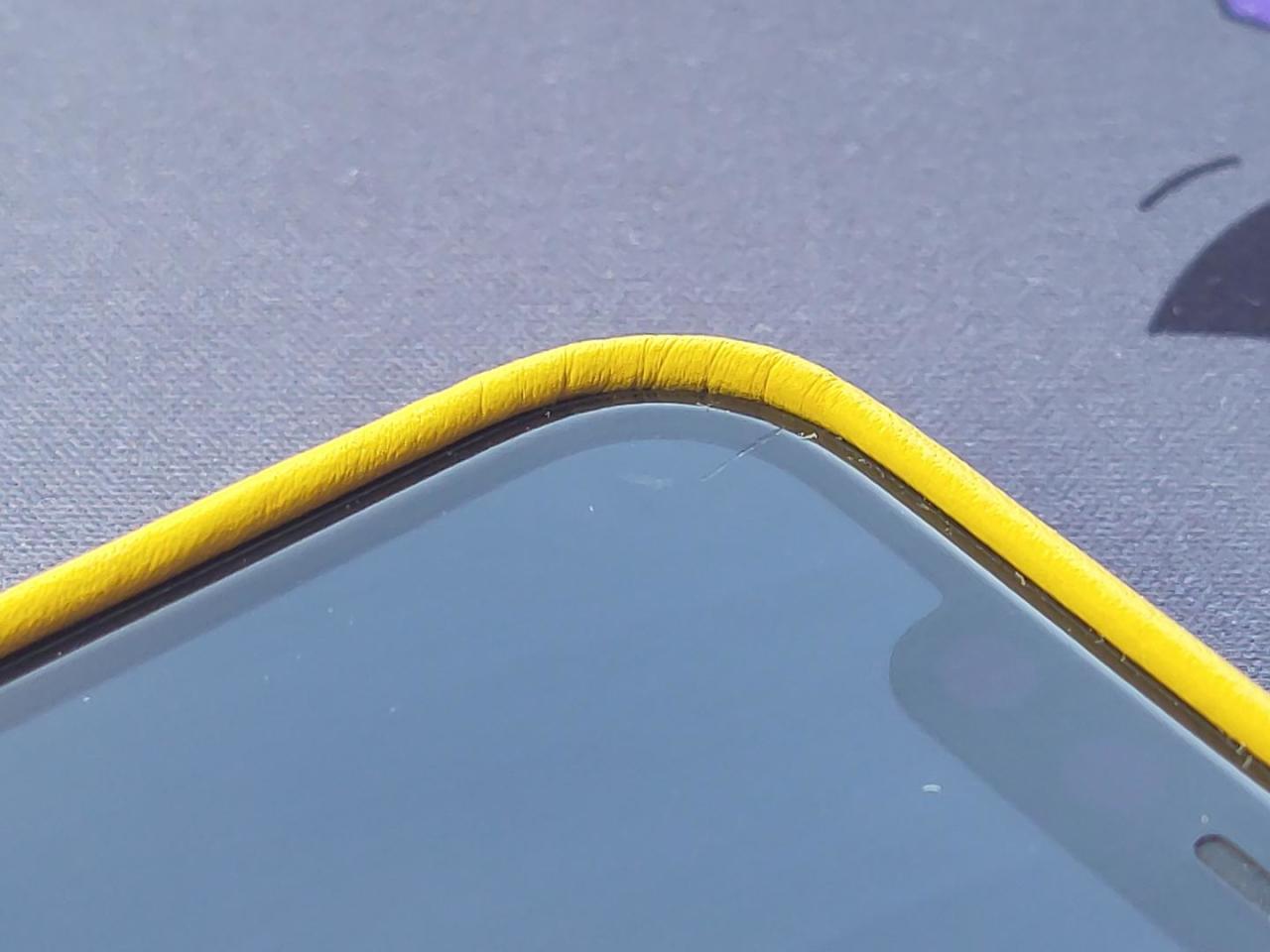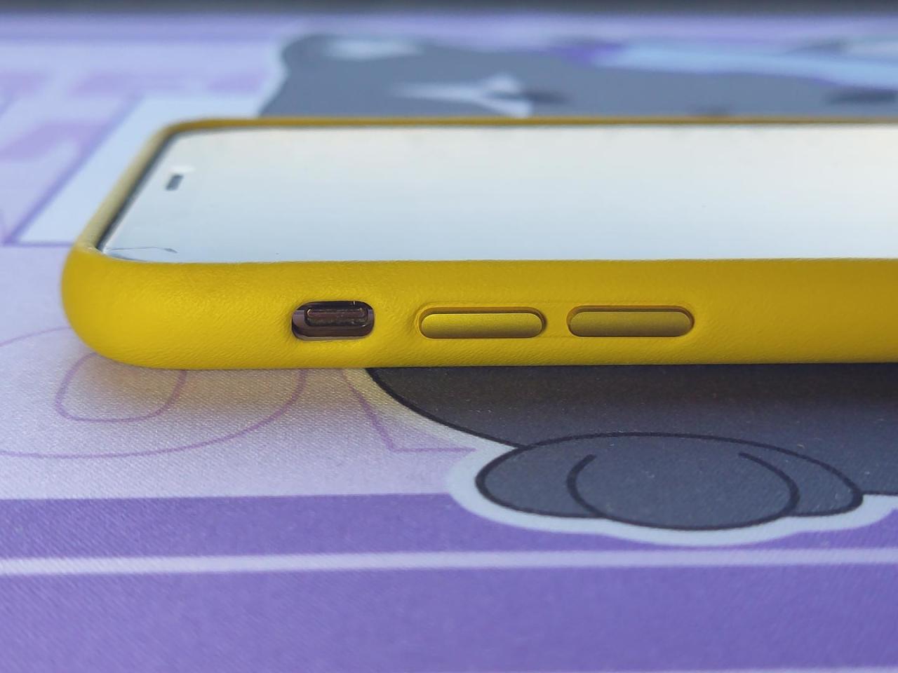 这个皮革保护套看似是上文皮革翻盖保护套的“减配”板,实则不然。这个黄色的皮革保护套是要比翻盖的厚的,貌似是中间多夹了一层塑料。这点可以从相机开孔的切边看出,因为这里并没有封边。