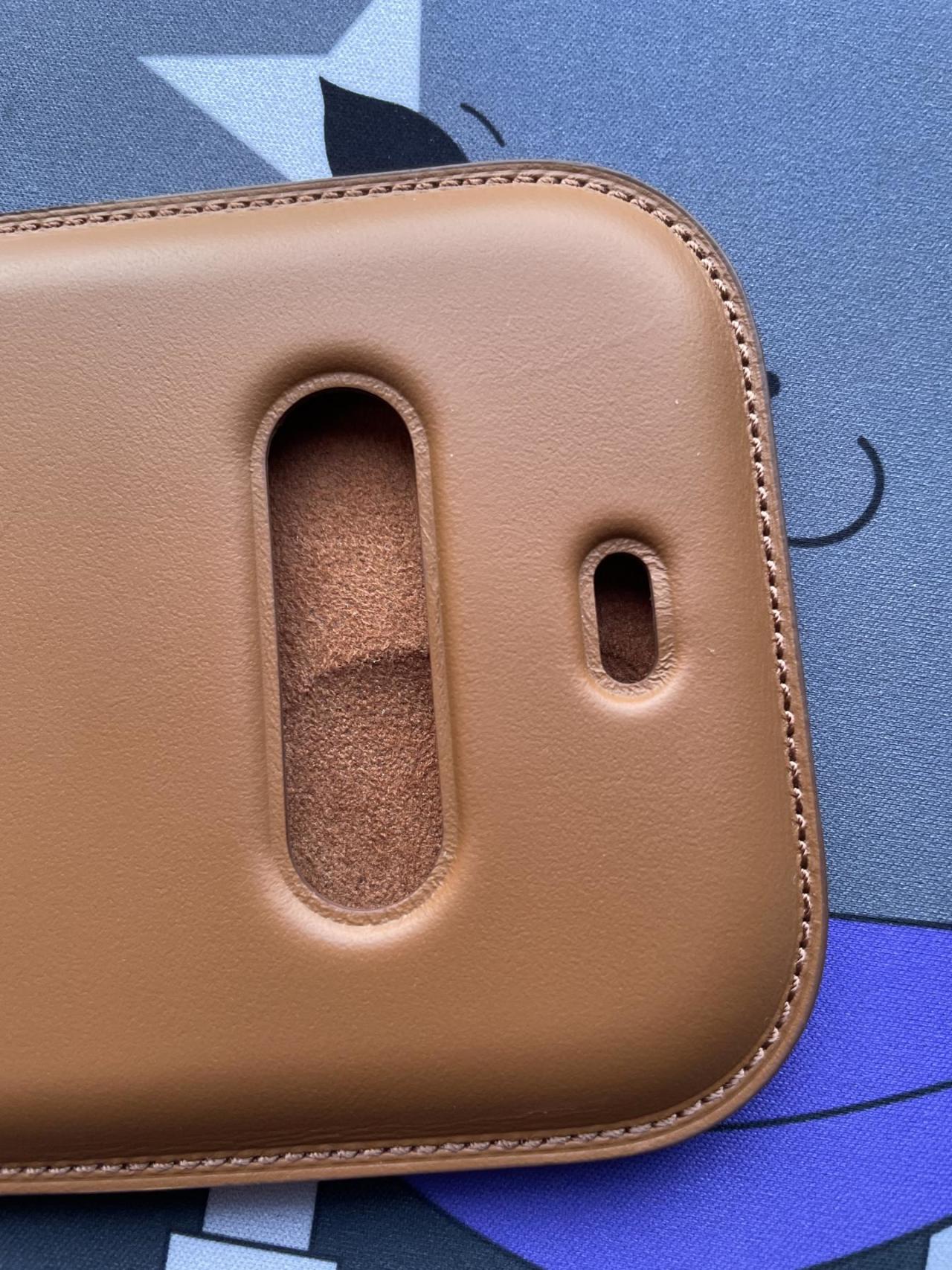 再说会保护套本身,全牛皮构成,边上有缝线和封边,背面有为摄像头预留的凸起,logo和其他皮革保护壳一样,用的是压印工艺