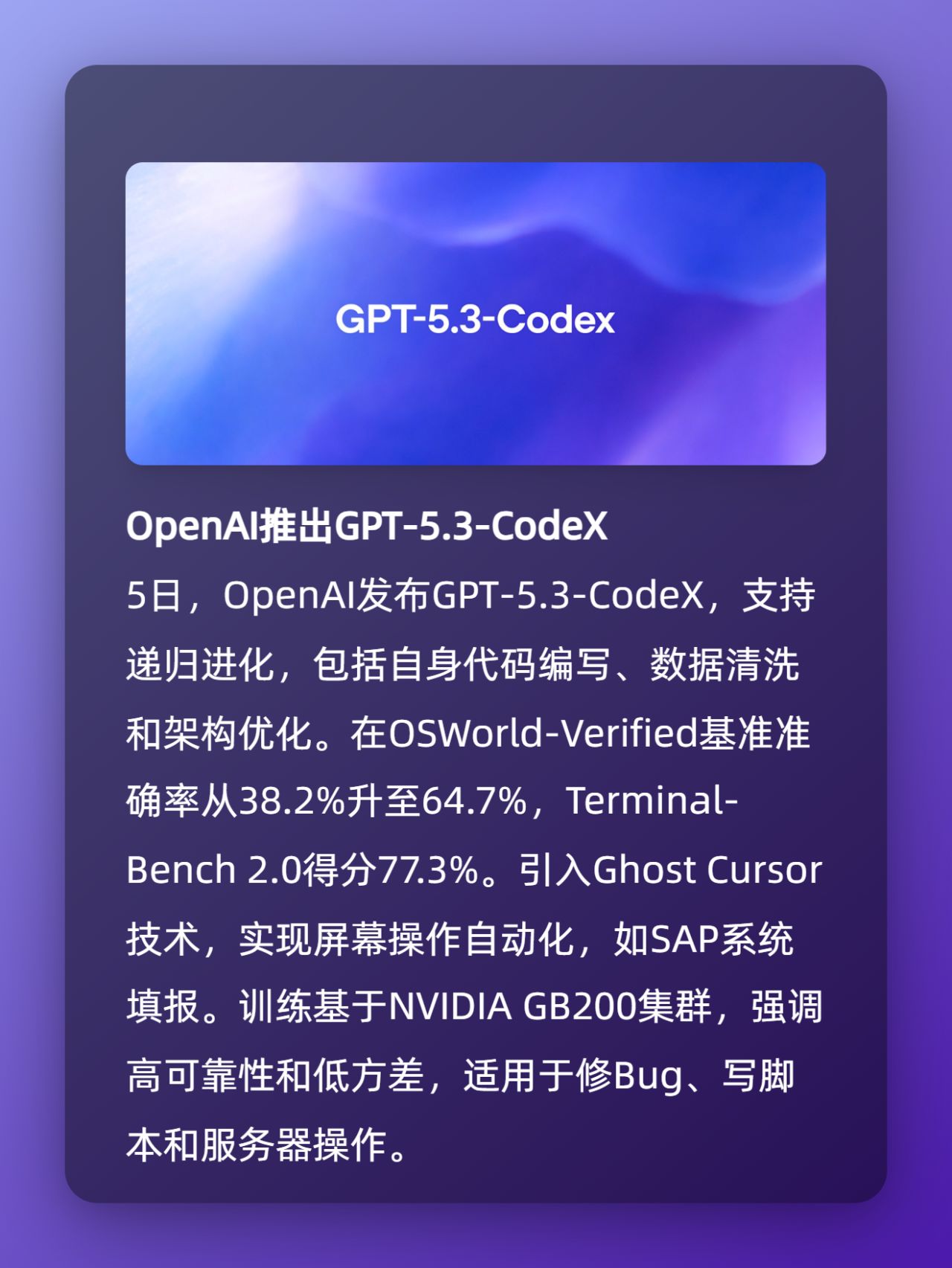 · OpenAI GPT-5.3-CodeX發佈:支持遞歸進化與屏幕自動化,基準準確率提升至64.7%,適用於代碼優化與系統操作;
