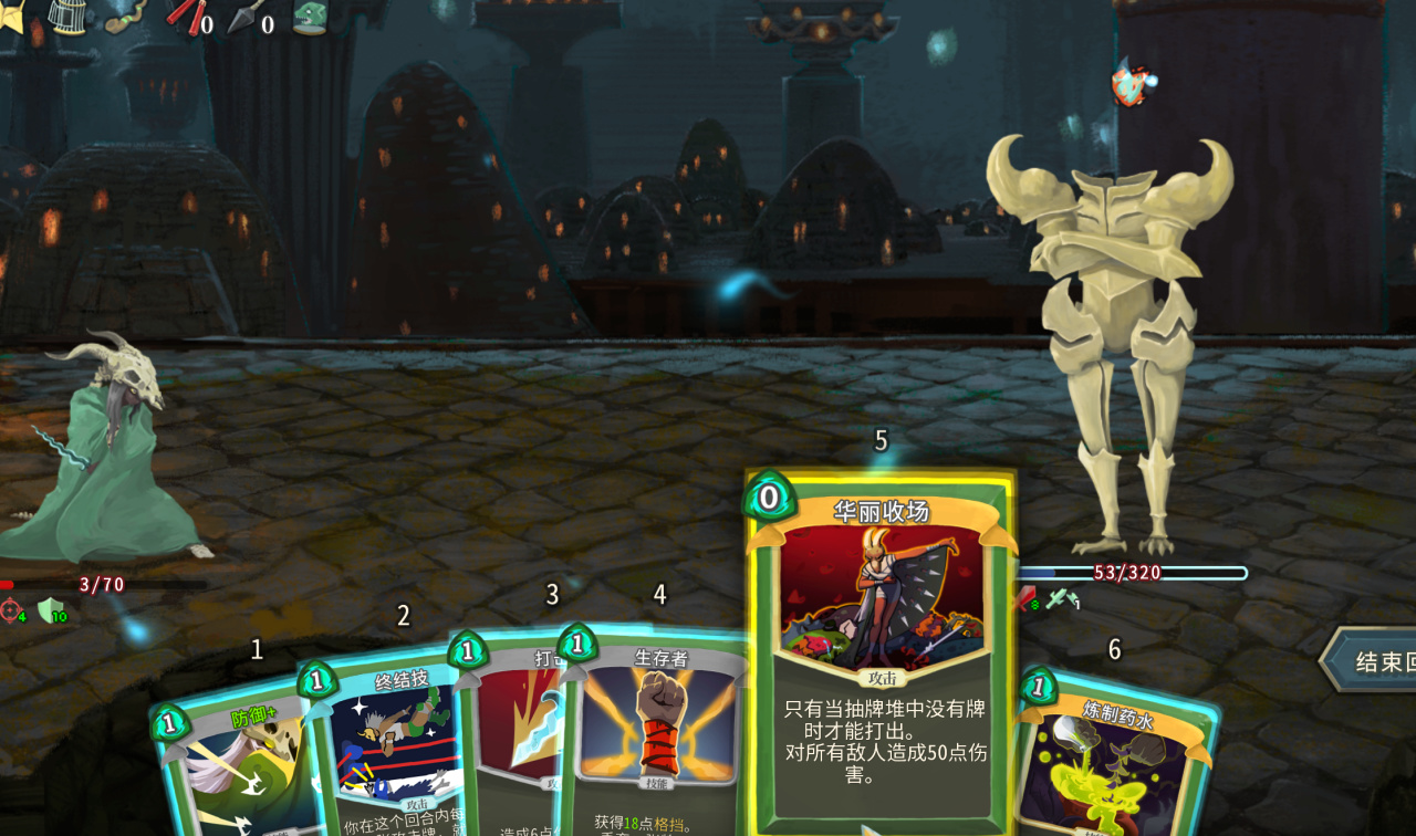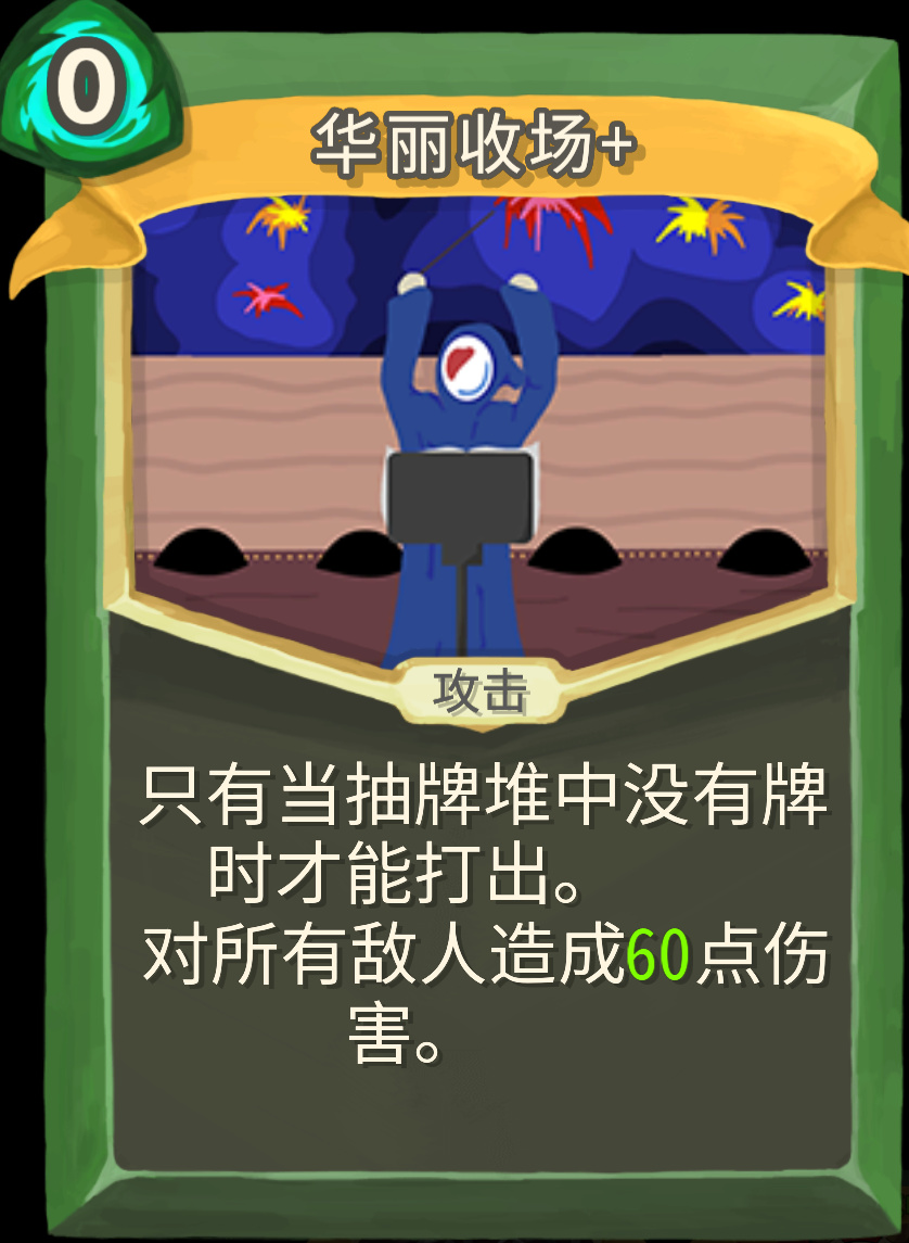 华丽收场是零费攻击卡,普通是群体打50点伤害,升级之后变为群体打60点伤害,这个面板伤害相当诱人,华丽流成型只靠一张卡输出就完全够了。游戏CH也给上了严苛的触发条件,需要在抽牌堆没有牌时才能使用,需要大家控制抽牌节奏,做一些简单的计算题。