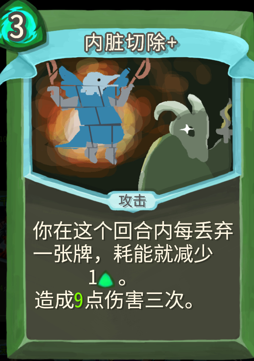 过渡攻击卡,小二推荐大家拿内脏切除,我们正常走华丽流,也是需要将运转体系成型,弃牌浓度一般都不低,拿一张内脏切除完全不亏。实在走不了华丽流,咱们还可以退而求其次走弃牌流,个人体感强行走华丽高进阶胜率非常低,拿一张过渡会好很多。