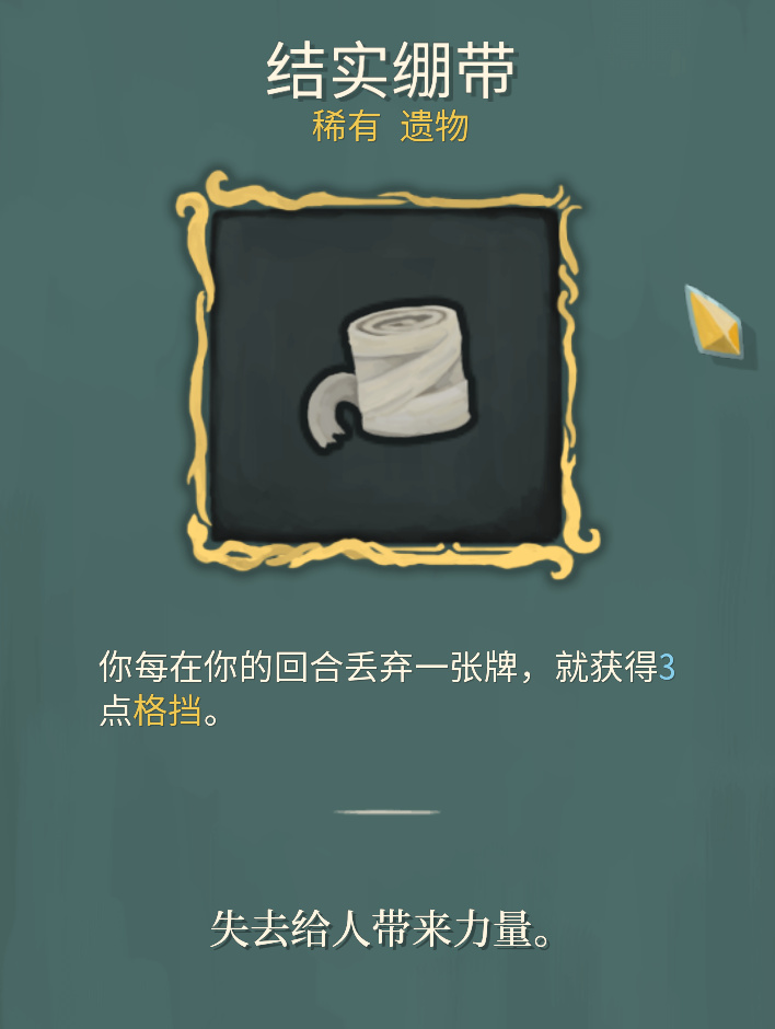 绷带是丢一张牌获得3格挡,小二在运转端推荐的卡有很多都自带弃牌效果,这也是猎手的职业特色之一,结实绷带在弃牌浓度高的卡组,表现都很不错。