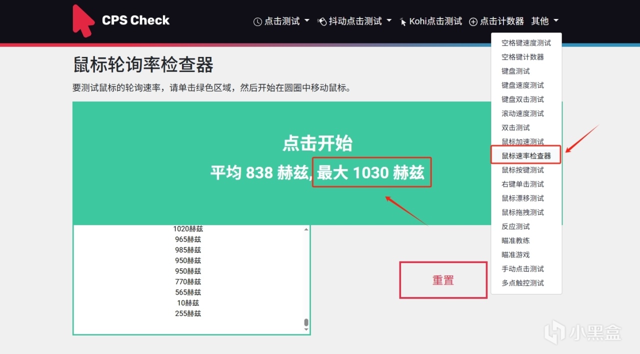 还可以测试鼠标性能,找到鼠标速率检查器,点击开始后快速滑动鼠标,显示的最高值就是鼠标的回报率。回报率越高,性能越强。